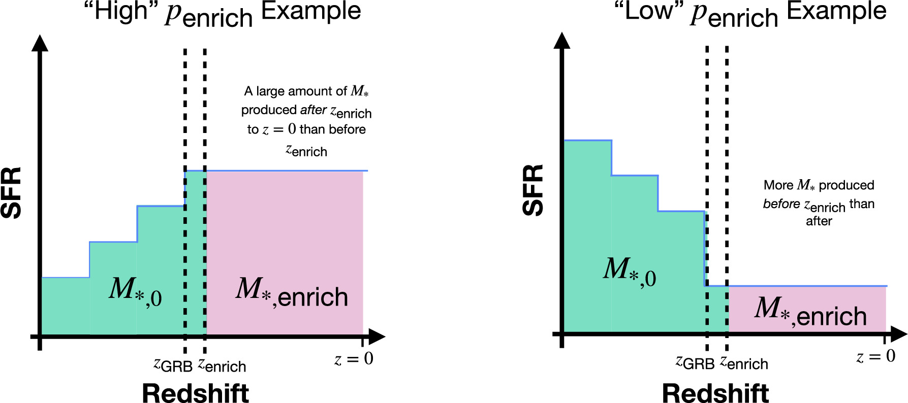 An illustration of penrich and how it is affected by the host’s SFH. In the “high” penrich example, a substantial fraction of stellar mass is produced after zenrich in the host compared to the amount of stellar mass formed before zenrich. In the “low” penrich example, the amount of stellar mass produced after zenrich is small in comparison to the amount formed before.
