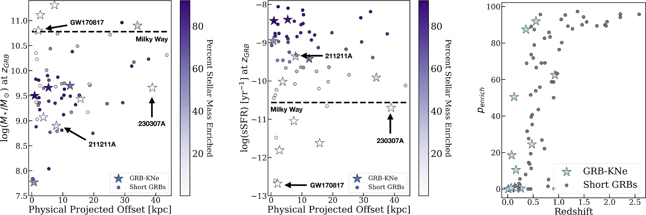Left: the host-galaxy stellar mass (at zGRB) vs. physical projected offset for our GRB-KN sample (stars) and the A. E. Nugent et al. (2022) short GRB sample (circles). The color indicates the percent of stellar mass enriched with r-process (penrich) from each event at z = 0, and the black dashed line denotes the Milky Way properties (T. C. Licquia & J. A. Newman 2015). Middle: the same figure, but for the specific SFR (SFR/M*) vs. physical projected offset. Right: the redshift vs. penrich at z = 0. While there does not appear to be a trend between penrich and host stellar mass, GRB offset, or redshift (at 0.3 ≲ z ≲ 1), we do find that penrich increases with sSFR. Importantly, this emphasizes that NS mergers occurring in environments with little ongoing star formation will have no impact on their r-process enrichment. From this, we can infer that not all NS mergers are contributing to stellar r-process enrichment.
