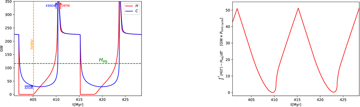 Left panel: heating and cooling rates. Right panel: integrated heating rate.