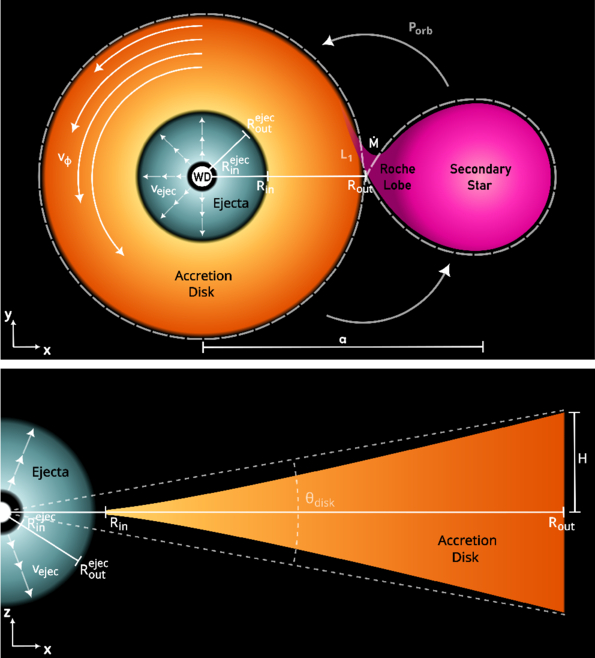 Orbital and axial view of the binary systems (not in scale). Only the ejecta and the accretion disk are included in the simulations. The values adopted for the different magnitudes are given in Tables 1 and 2.