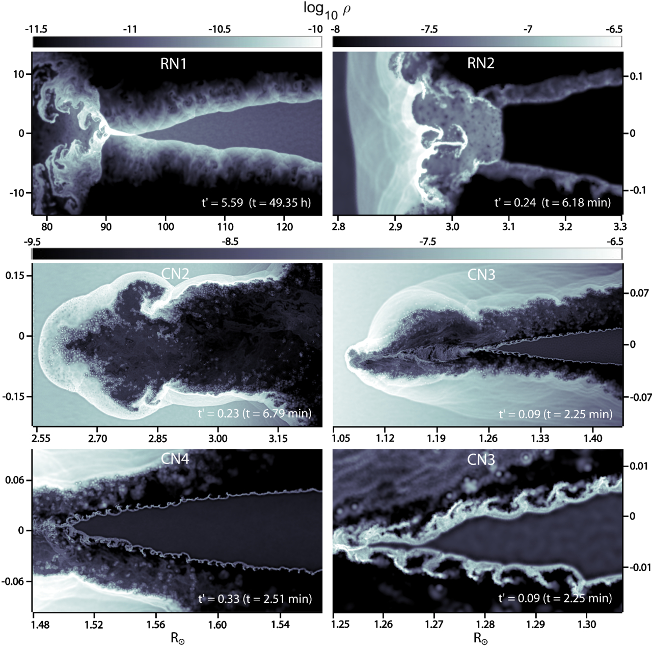 Density maps, in log scale, showing the formation of turbulent structures during the interaction.