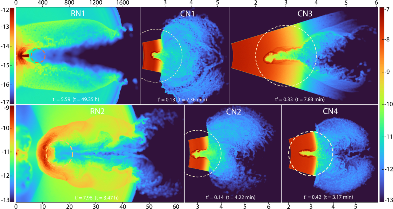 Density plot in logarithmic scale of the final remnants after the interaction has ceased. The dashed lines represent the location of the secondary star. As mentioned before, the companion in model RN1 is a red giant of ∼110 R⊙. Due to the orbital characteristics and accretion rate adopted in model RN2, the best fit for the companion is a subgiant between 4 and 6 R⊙. In our case we decided to use a 1 M⊙ and 5.23 R⊙ star so that the system shared the same geometric proportions as in model RN1. In the case of the CN and SN Ia models the companion is a Sun-like main-sequence star with 1 R⊙ and 1 M⊙.