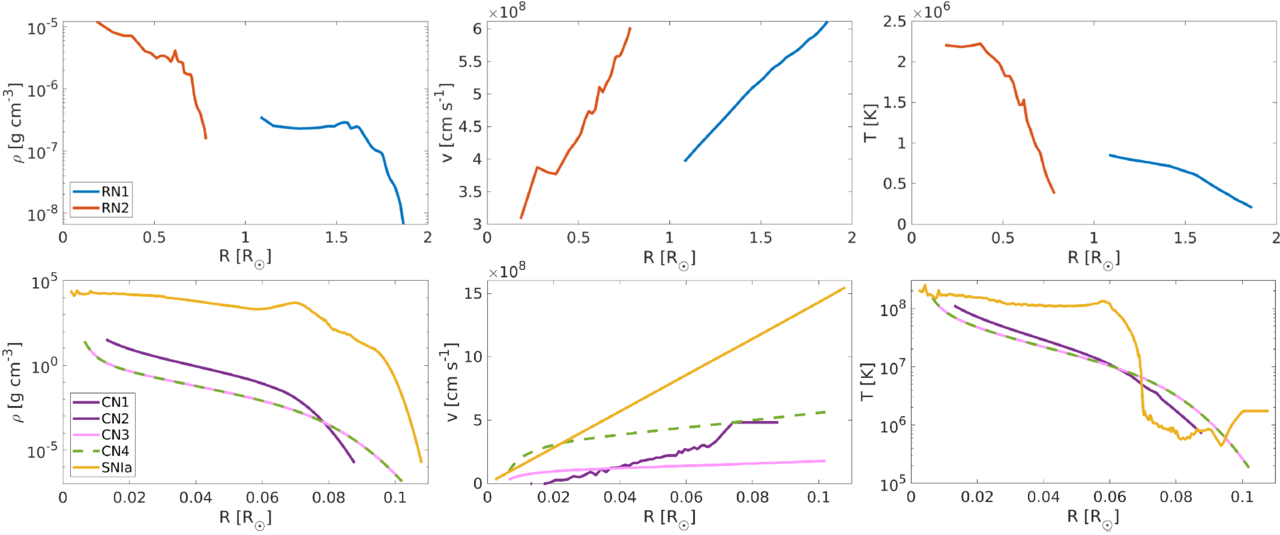 Hydrodynamic profiles of the ejecta in the different models computed in this work. Models CN1 and CN2 share the same ejecta and differ only in the properties of their accretion disks.
