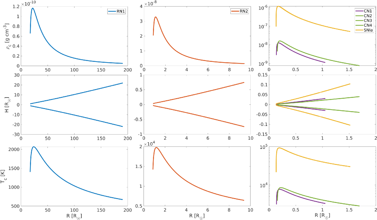 Density, height, and temperature profiles of the different accretion disks considered in this work. The subscript in ρc and Tc refers to the value of the magnitude at the center (z = 0). Notice the different sizes in the x-axis due to the different orbital periods considered, as well as the effect of the high accretion rate in the SN Ia case.