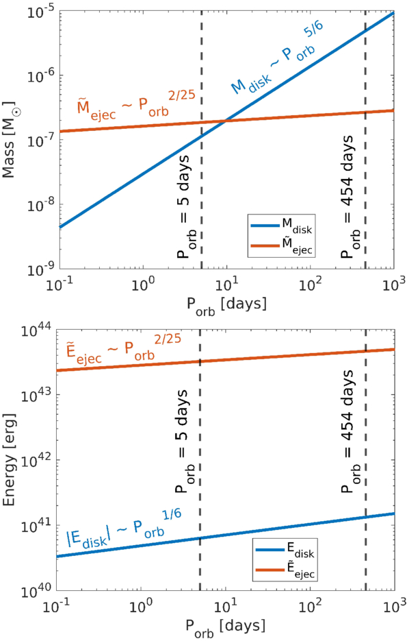 Masses and energy of the generated accretion disk and effective ejecta (for models RN1 and RN2) as a function of the orbital period Porb. The disk has lower densities for larger values of Porb, but its total mass increases. Nonetheless, the disk remains thin: the opening angle and, in consequence, ﹩{\tilde{M}}_{\,\rm{ejec}\,}﹩ barely increase. The bottom panel shows the absolute value of Edisk since it mostly corresponds to negative potential binding energy.