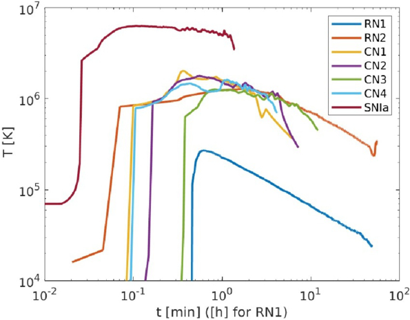 Time evolution of the maximum temperature reached by the shocked region in the disk.