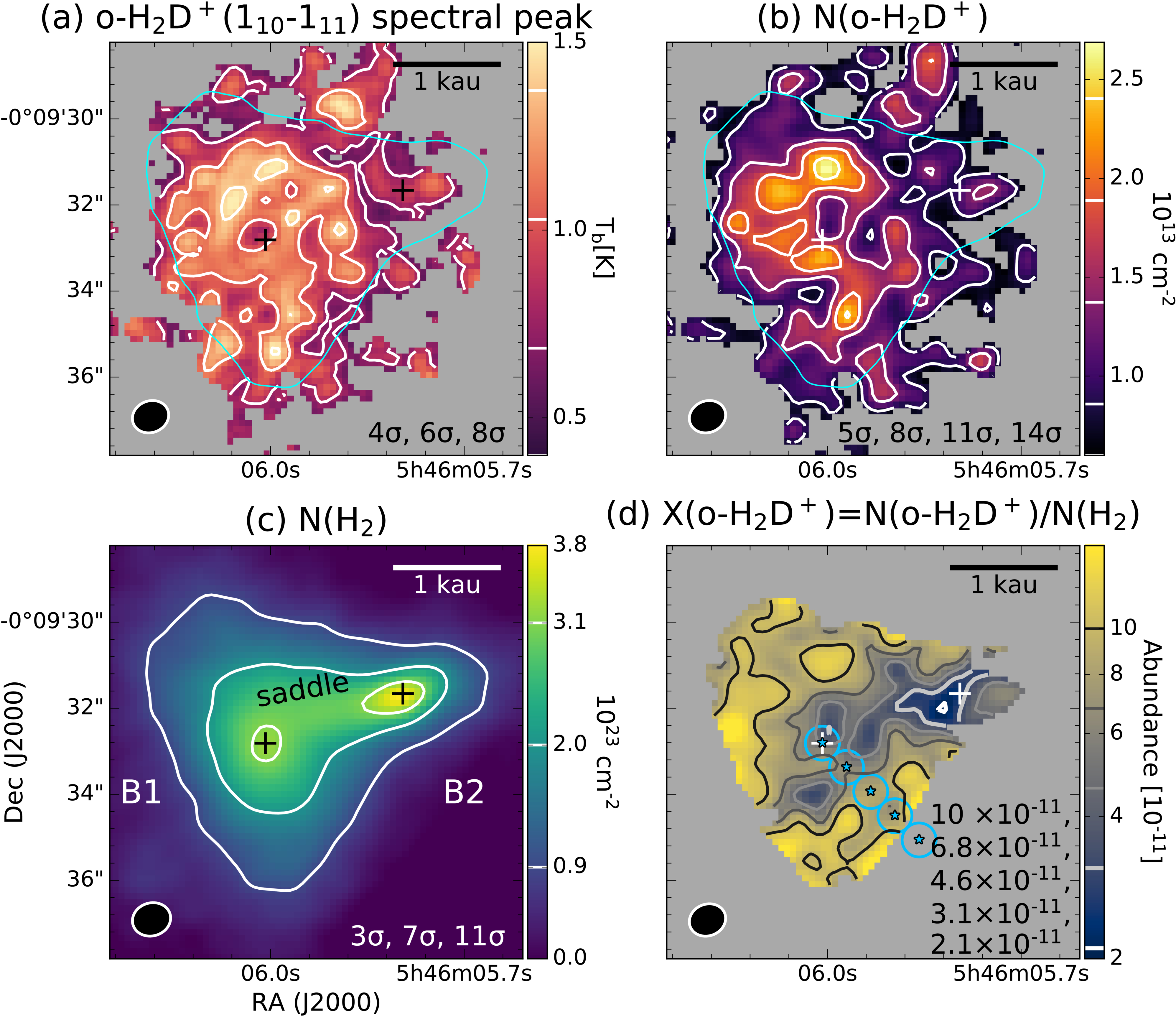 Ortho-H2D+ column density analysis assuming LTE with Tex = 8 K. Calculations are limited to regions with ortho-H2D+ (110–111) integrated intensities of S/N > 3. (a) Spectral peak map overlaid with contour levels at 4σ, 6σ, and 8σ, where 1σ = 0.17 K. These ﹩{T}_{{\rm{b}}}﹩ contour levels correspond to optical depths, ﹩{\tau }_{\nu }﹩, of the order of 0.4, 0.7, and 1.0. (b) o-H2D+ column density map, N(o-H2D+), overlaid with contour levels at 5σ, 8σ, 11σ, and 14σ, where σ = 1.7 × 1012 cm-2. (c) Molecular hydrogen column density map, N(H2), derived from dust continuum emission assuming Tdust = 8 K. Contour levels are at 3σ, 7σ, and 11σ, corresponding to 8.5 × 1022, 2.0 × 1023, and 3.1 × 1023 cm−2, with σ = 2.8 × 1022 cm−2. (d) Column abundance map, X(o-H2D+) = N(o-H2D+)/N(H2), masked at the cyan N(H2) 3σ contour, with logarithmically spaced X(o-H2D+) contour levels annotated on the panel. Crosses mark the substructures B1 and B2, and cyan asterisks/circles indicate positions used for non-LTE radiative transfer modeling (Section 4.3). Beam sizes and spatial scales are shown in the bottom left and top right corners, respectively.