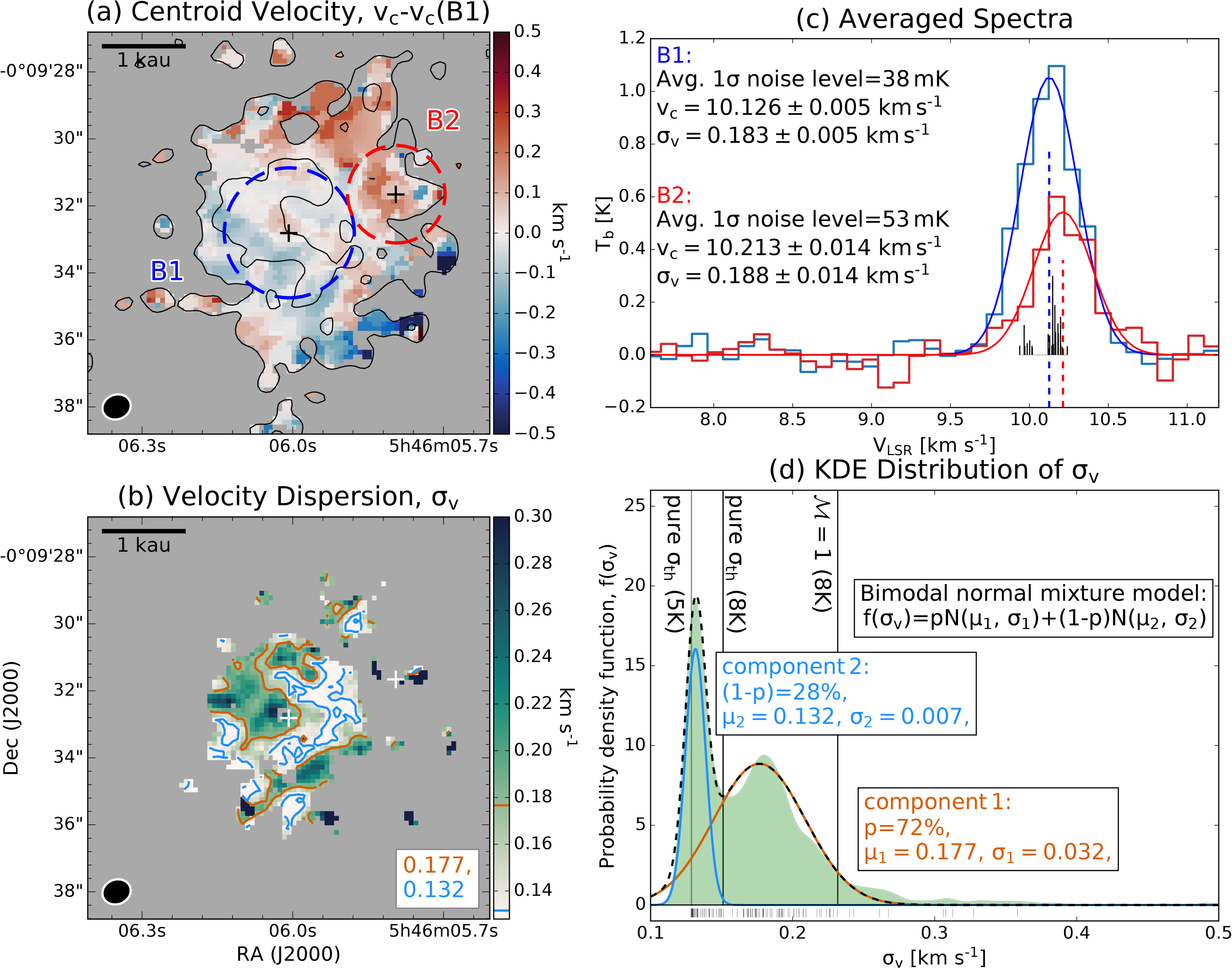 G205.46−14.56 M3 kinematics traced by ortho-H2D+. (a) Centroid velocity map, using data with ≥3σ detection on the integrated-intensity map (with the 3σ and 7σ contours overlaid; see Figure 1(b)). (b) Velocity dispersion map, only using data with ≥5σ detection at the spectral peaks. (c) Averaged spectra for B1 (blue) and B2 (red), extracted from the regions enclosed by the corresponding dashed circles in panel (a), with fitted Gaussian profiles and annotated parameters. The centroid velocity of B1 serves as the velocity reference in panel (a). The normalized o-H2D+ (110–111) HFS pattern is also shown in black beneath the B1 spectrum. (d) KDE distribution of velocity dispersions with a rug plot. The fitted bimodal model and its parameters are annotated, with the two dispersion peaks overlaid on panel (b) as contours. Vertical lines show the expected velocity dispersion including channel broadening for pure thermal cases and ﹩{ \mathcal M }=1﹩ cases assuming 5 K and/or 8 K (see Appendix C).