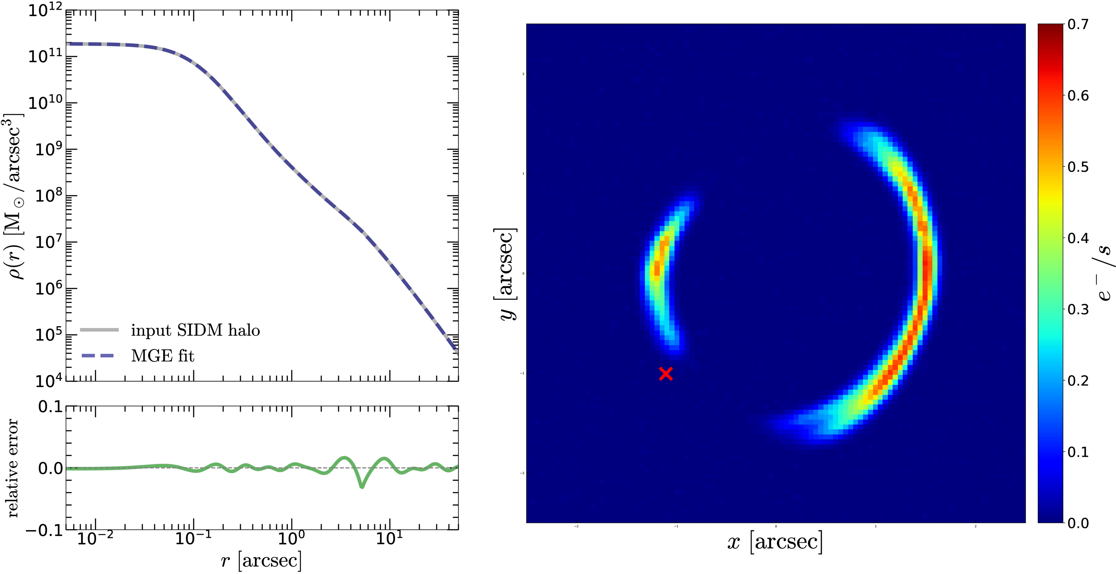 Left: the MGE fitting result for the density profile of the input SIDM halo. The 3D density profile of the perturber is shown as a gray line, while the MGE fitting result is represented by a navy dashed line. The relative error is illustrated in the bottom subplot. Right: the mock lensing image, with the red cross representing the position of the input SIDM halo.