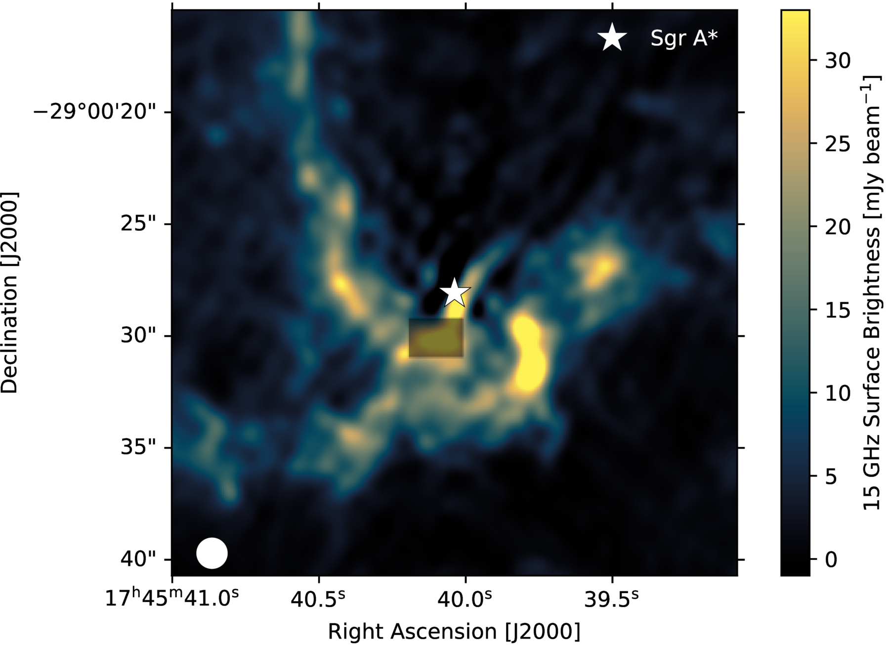 15 GHz VLA image. The gray box indicates the region used to model the Mini-spiral extinction, and the location of Sgr A* is indicated with a white star. The white circle in the bottom left indicates the beam size smoothed to JWST/MIRI 17.98 μm resolution.