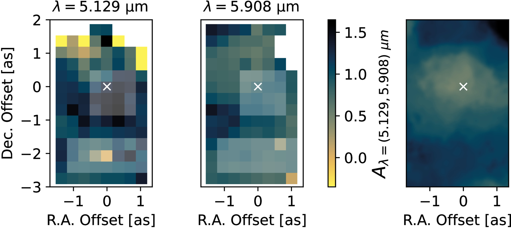 Spatial variation of the line-derived extinction values for the 5.129 μm and 5.908 μm hydrogen recombination lines. The color bar shows the relative extinction measurements from the line ratios (A5.129/7.46 and A5.908/7.46) after they were converted to absolute extinction values by adding A7.46 = 0.64 mag derived from the Mini-spiral extinction measurement (Section 4.2). The white cross shows the approximate location of Sgr A*, and the lighter patches illustrate the two aperture masks used to obtain the line measurements in Figure 7. The rightmost panel shows the K-band extinction map derived from stellar colors (R. Schödel et al. 2010). The K band has higher absolute extinction (﹩{\left\langle A\right\rangle }_{2.16}\approx 2.4\,{\rm{mag}}﹩) but shows spatial variations similar to the MIR.