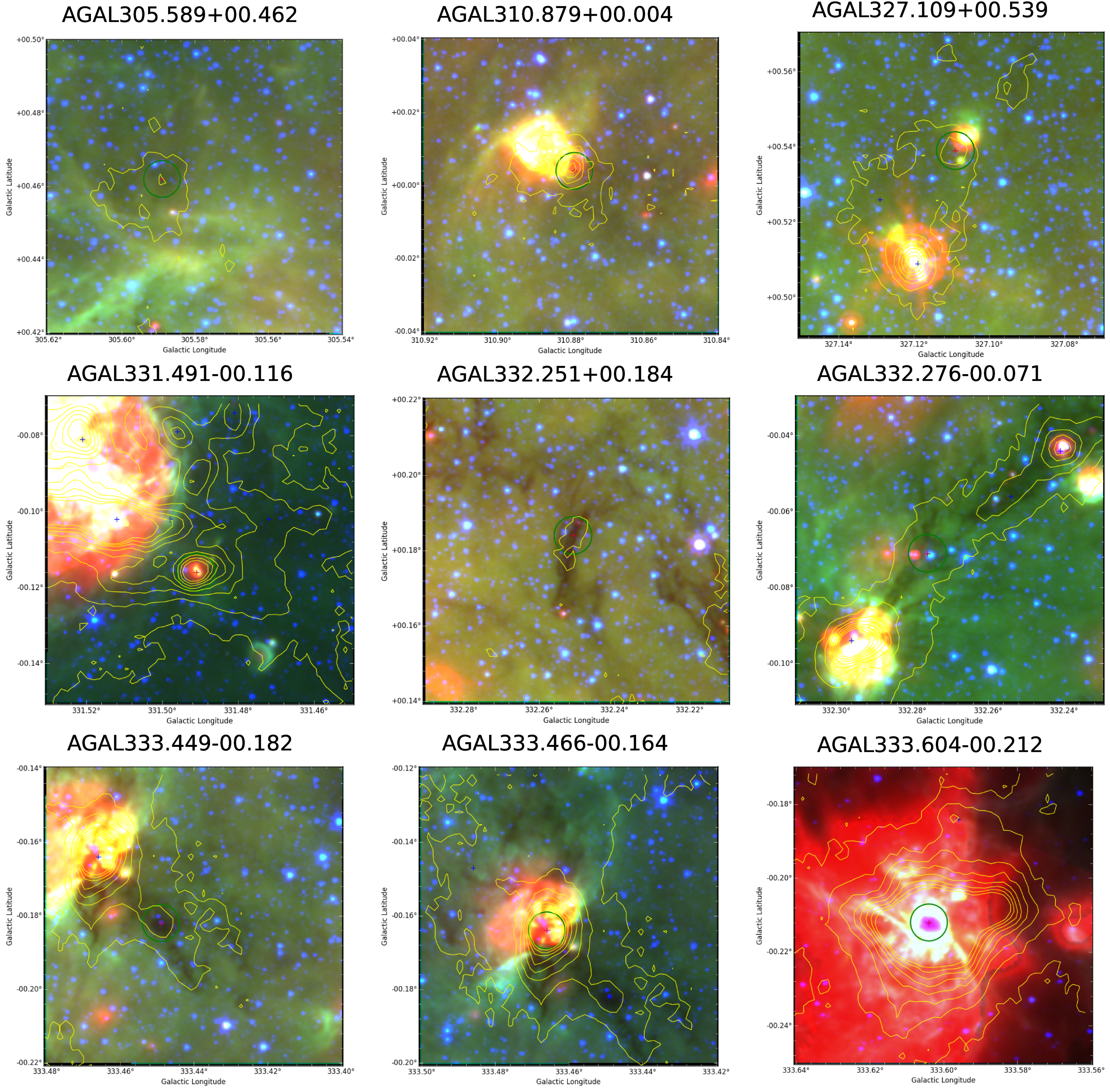 Spitzer mid- (GLIMPSE) and far-infrared (MIPSGAL) images of the selected sources, with 3.6 μm in blue, 8.0 μm in green, and 24 μm in red. Red crosses indicate the source position. The green circle indicates the size of the Mopra beam and the observed position. Yellow contours indicate ATLASGAL 870 μm flux with levels at 0.1 Jy beam−1.