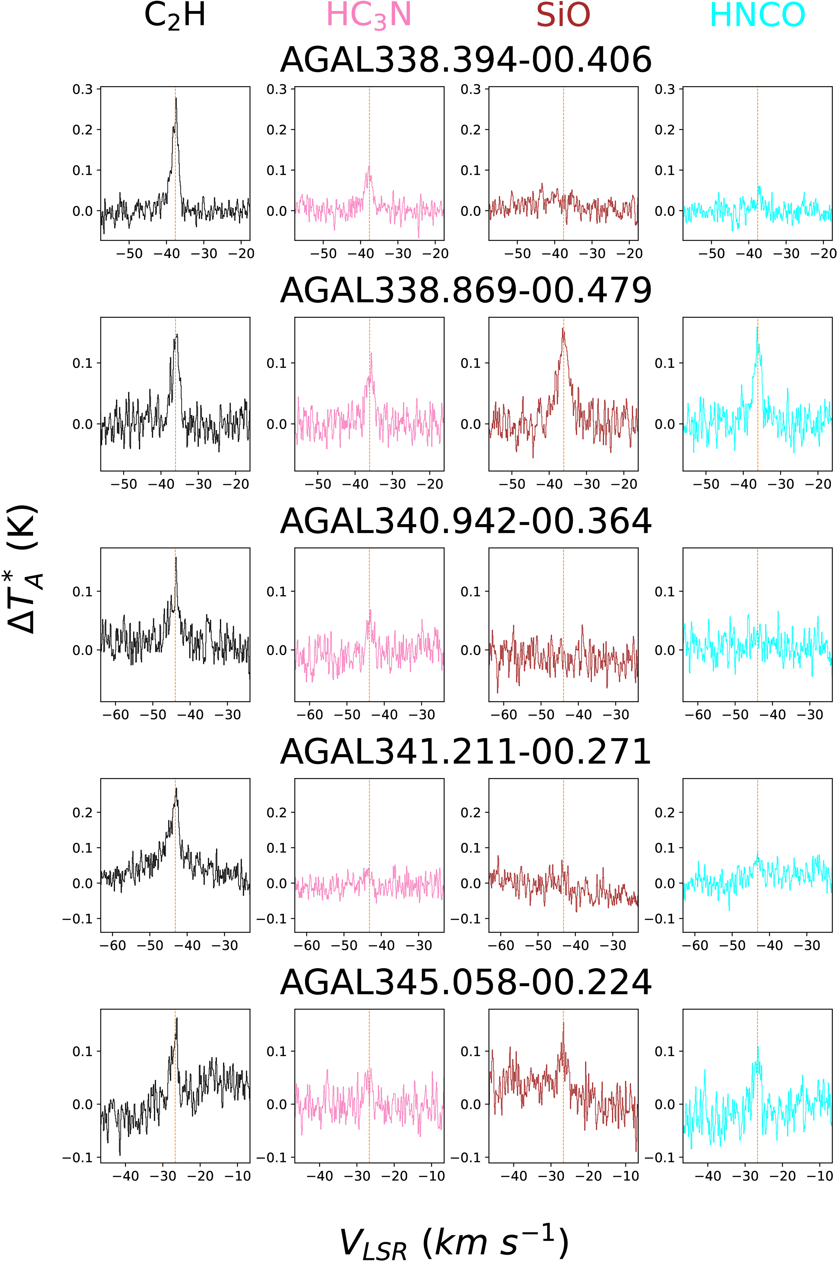 Mopra 3 mm spectra of the C2H (N = 1–0; J = 3/2–1/2; F = 2–1), HC3N (10–9), HNCO (40,4–30,3), and SiO (2–1) lines. Same as Figure 10, but for different sources.