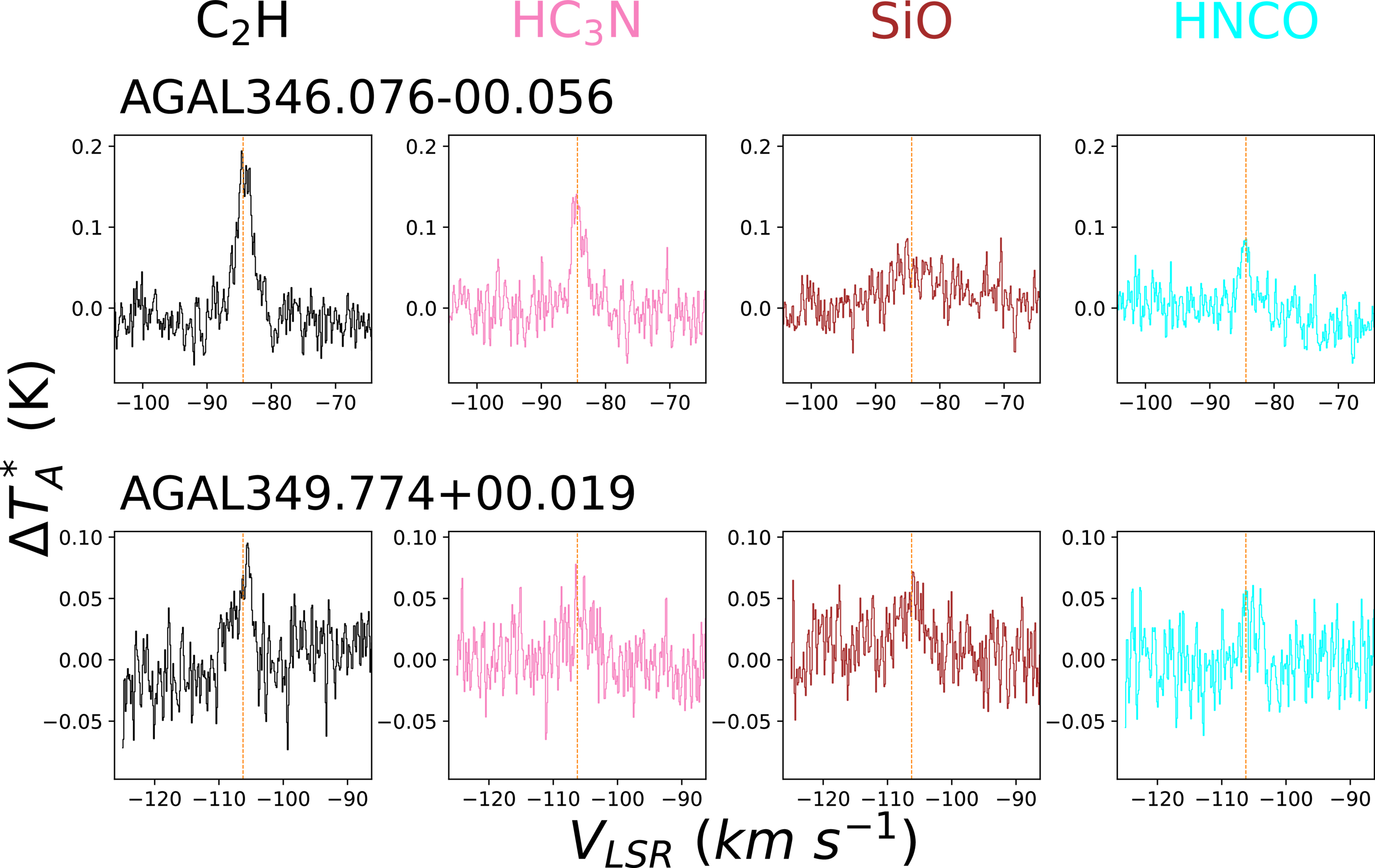 Mopra 3 mm spectra of the C2H (N = 1–0; J = 3/2–1/2; F = 2–1), HC3N (10–9), HNCO (40,4–30,3), and SiO (2–1) lines. Same as Figure 10, but for different sources.