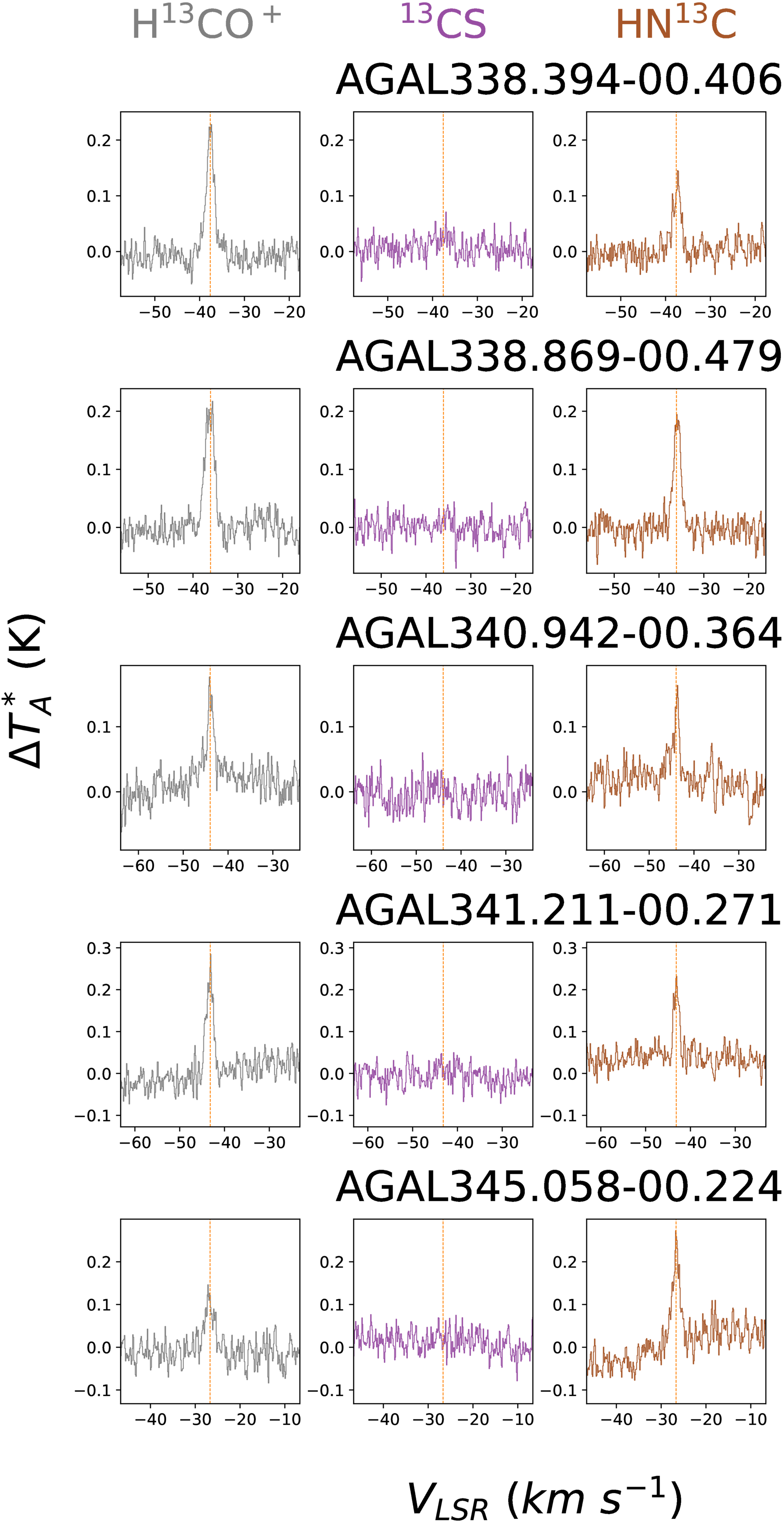 Mopra 3 mm spectra of the H13CO+ (1–0), HN13C (1–0), and 13CS (2–1) lines. Same as Figure 16, but for different sources.