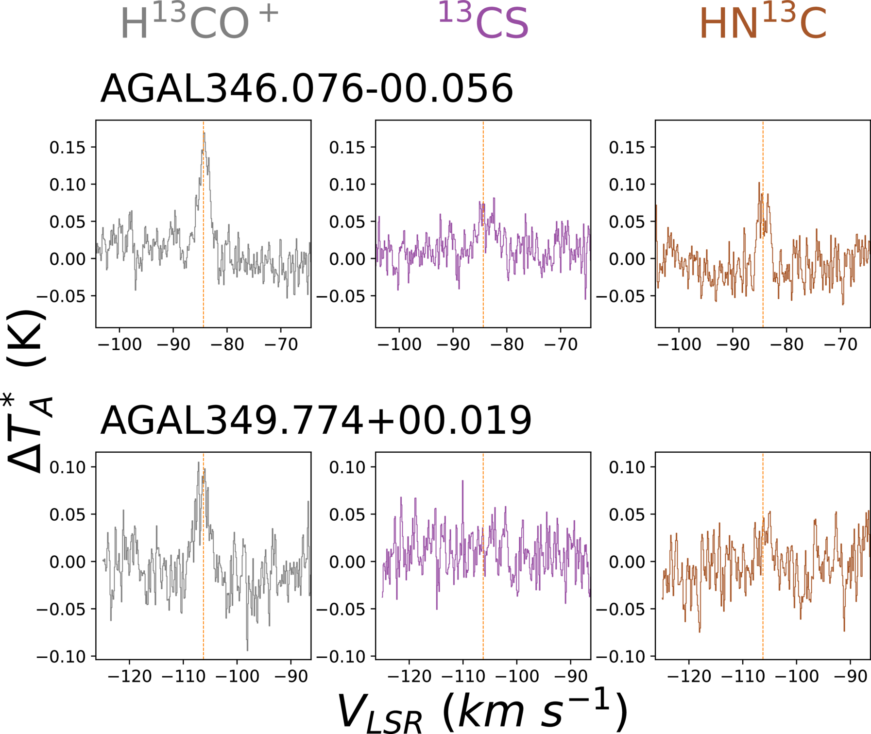 Mopra 3 mm spectra of the H13CO+ (1–0), HN13C (1–0), and 13CS (2–1) lines. Same as Figure 16, but for different sources.