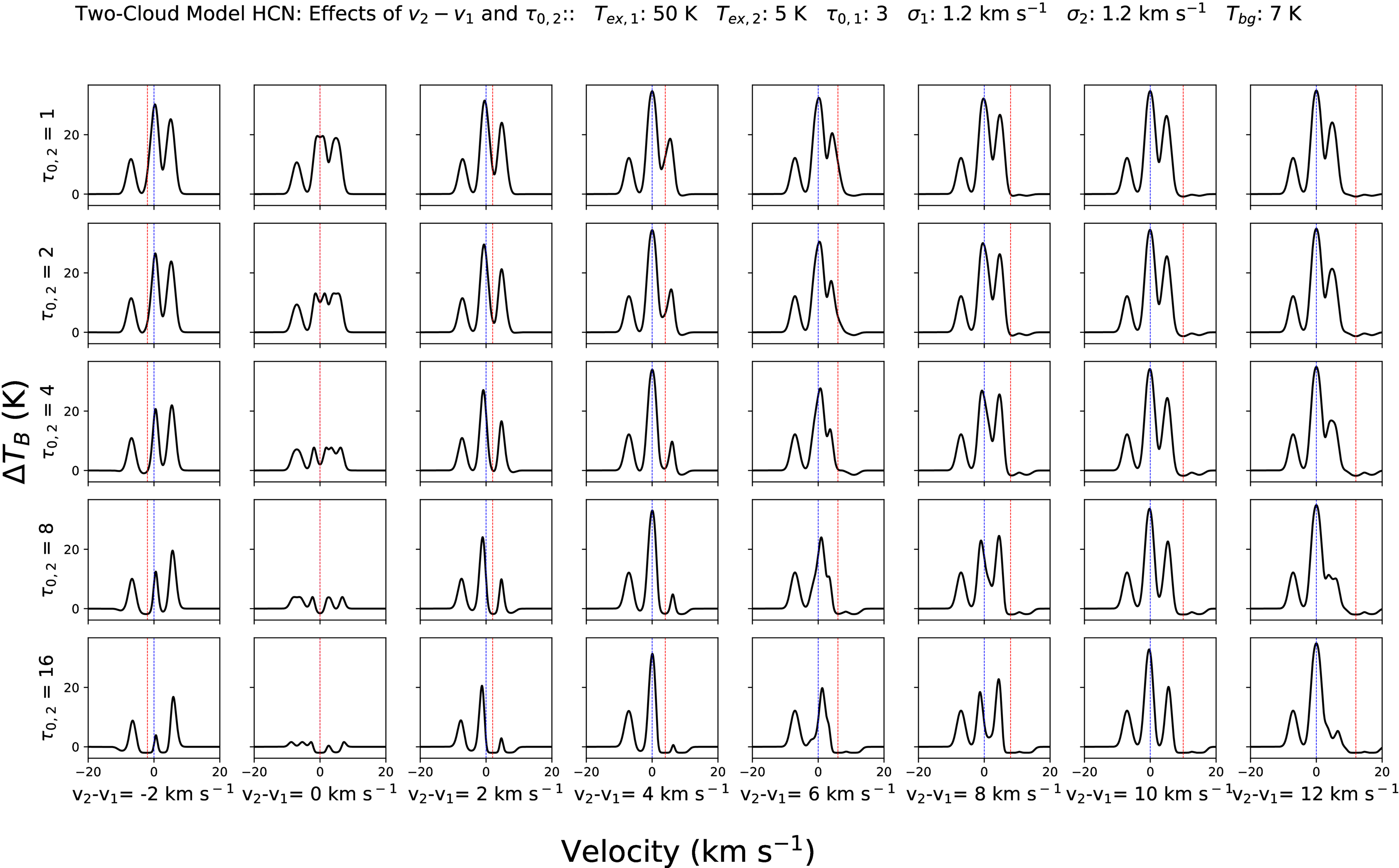 Simulated line profiles of HCN (1–0) in a simple two-cloud model. The blue vertical lines represent the velocity of the warm background cloud and the red vertical lines the velocity of the cold foreground cloud. The profiles show a grid of various foreground cloud optical depths and velocity offsets, with foreground cloud optical depth ranging from 1 to 16, varying by factors of 2 (y-direction) and offset velocities V2 − V1 ranging from −2 to 12 km s−1, in steps of 2 km s−1 (x-direction). Parameters for this particular model are shown in the title. The rightmost F = 1 → 1 hyperfine line in the background cloud is suppressed by self-absorption by the main F = 2 → 1 hyperfine line in the foreground cloud for large foreground optical depths and velocity offsets of ∼2–8 km s−1, shown in the lower-middle panels in the plot.