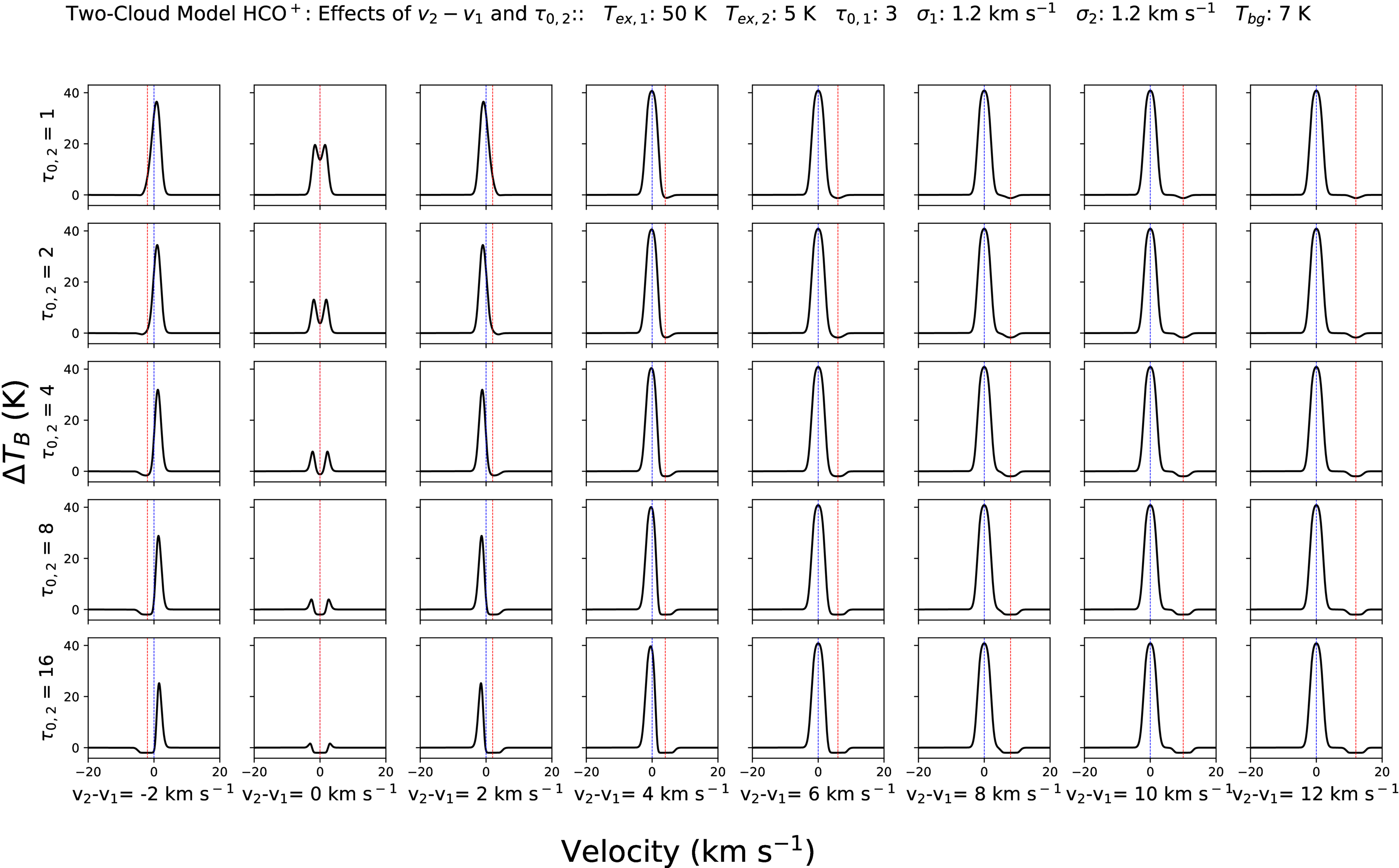 Simulated line profiles of HCO+ (1–0) in a simple two-cloud model. The blue vertical lines represent the velocity of the warm background cloud and the red vertical lines the velocity of the cold foreground cloud. The profiles show a grid of various foreground cloud optical depths and velocity offsets, with foreground cloud optical depth ranging from 1 to 16, varying by factors of 2 (y-direction) and offset velocities V2 − V1 ranging from −2 to 12 km s−1, in steps of 2 km s−1 (x-direction). Parameters for this particular model are shown in the title. The line profiles show skewed, blue asymmetries for large foreground optical depths and velocity offsets of ∼2–8 km s−1, shown in the lower-middle panels in the plot.