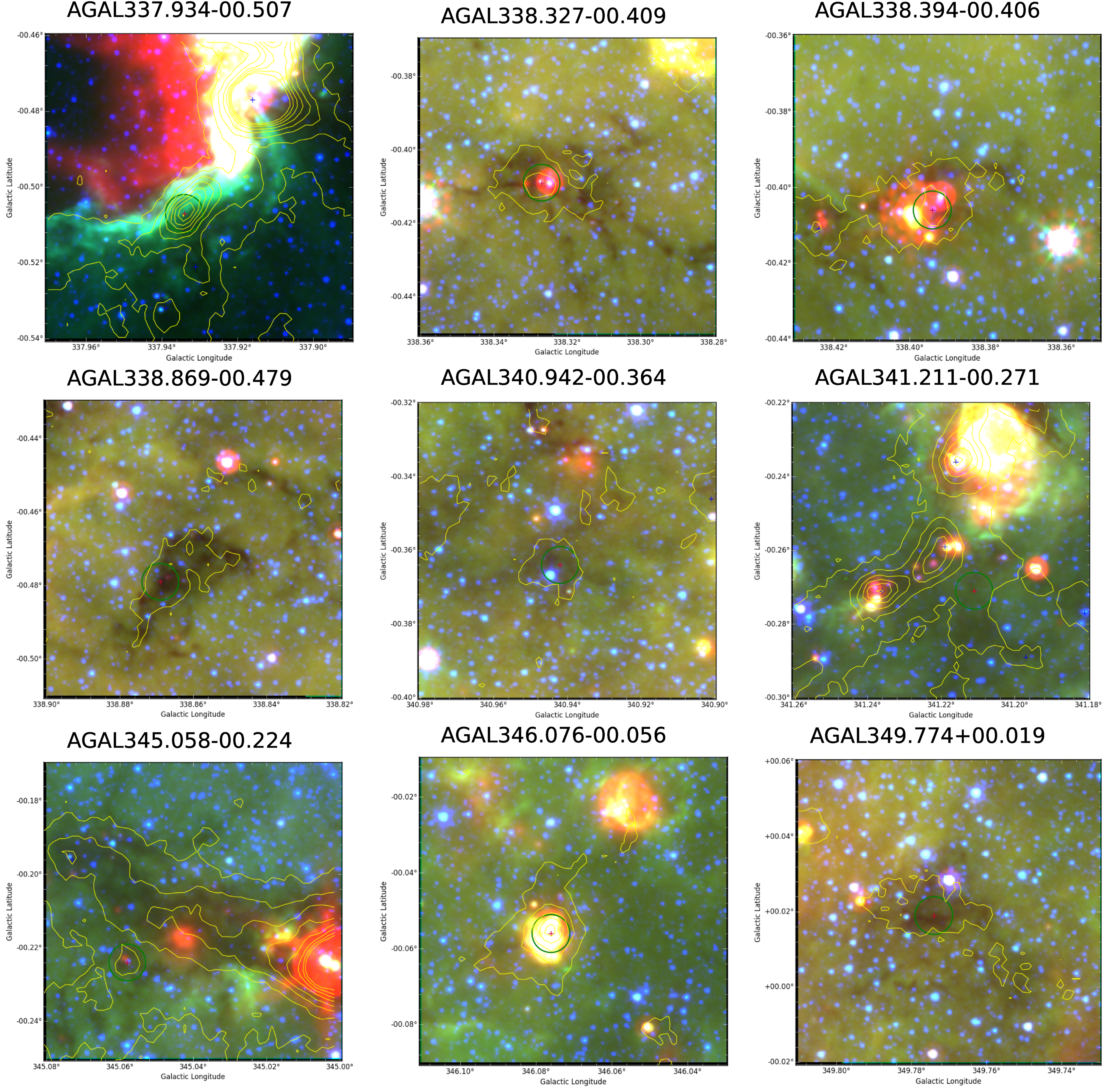 Spitzer mid- (GLIMPSE) and far-infrared (MIPSGAL) images of the selected sources, with 3.6 μm in blue, 8.0 μm in green, and 24 μm in red. Red crosses indicate the source position. The green circle indicates the size of the Mopra beam and the observed position. Yellow contours indicate ATLASGAL 870 μm flux with levels at 0.1 Jy beam−1. The figure showing ATLASGAL images was deleted as it is redundant; the ATLASGAL maps are also shown in Figures 1–3.