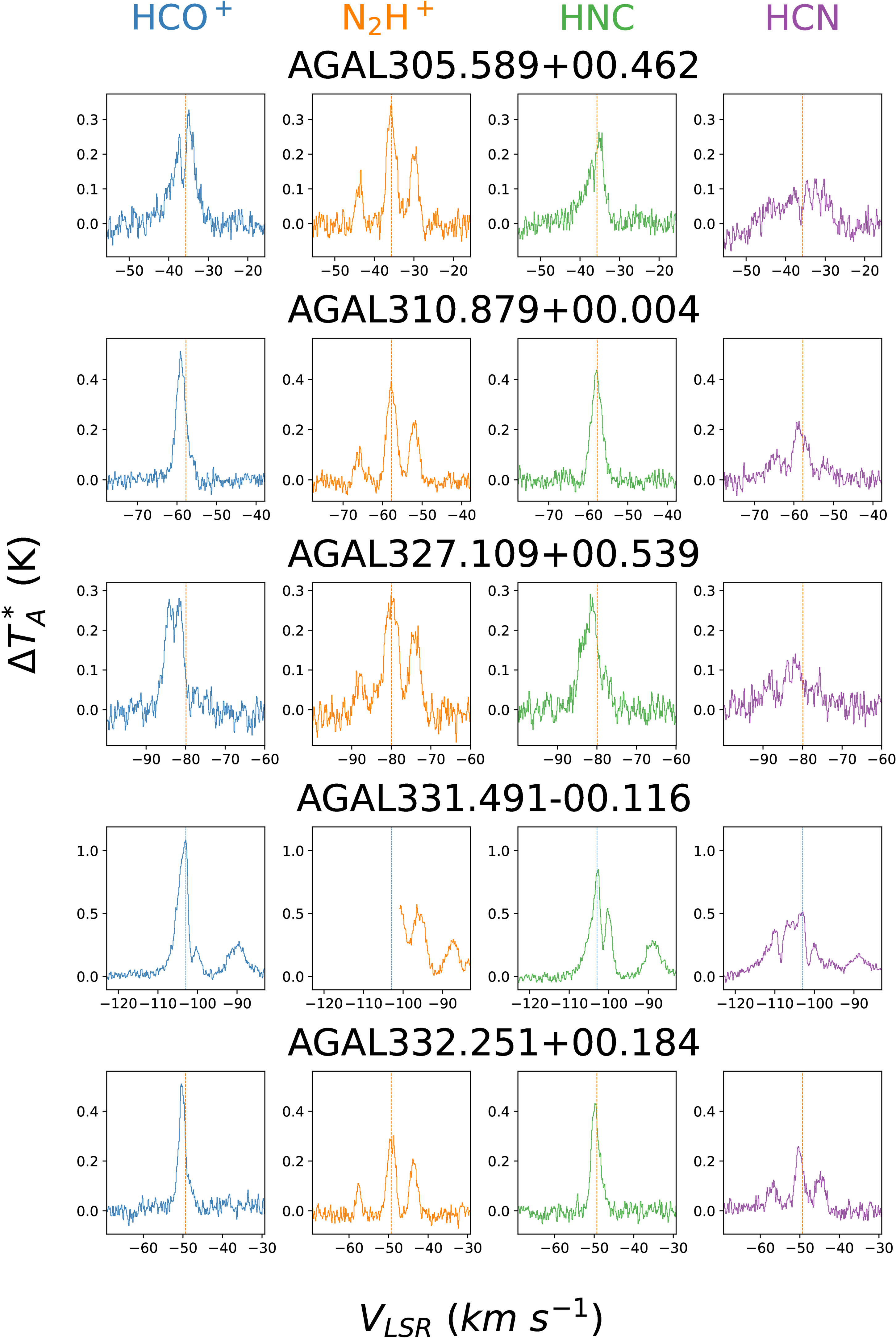The figures containing the spectra were reformatted to display each line in individual subpanels. Mopra 3 mm spectra of the HCO+ (1–0), N2H+ (1–0), HCN (1–0), and HNC (1–0) lines. The vertical lines show the fitted velocity of the N2H+ (1–0) line in orange, if available, otherwise the velocity of the peak HCO+ (1–0) intensity in cyan.