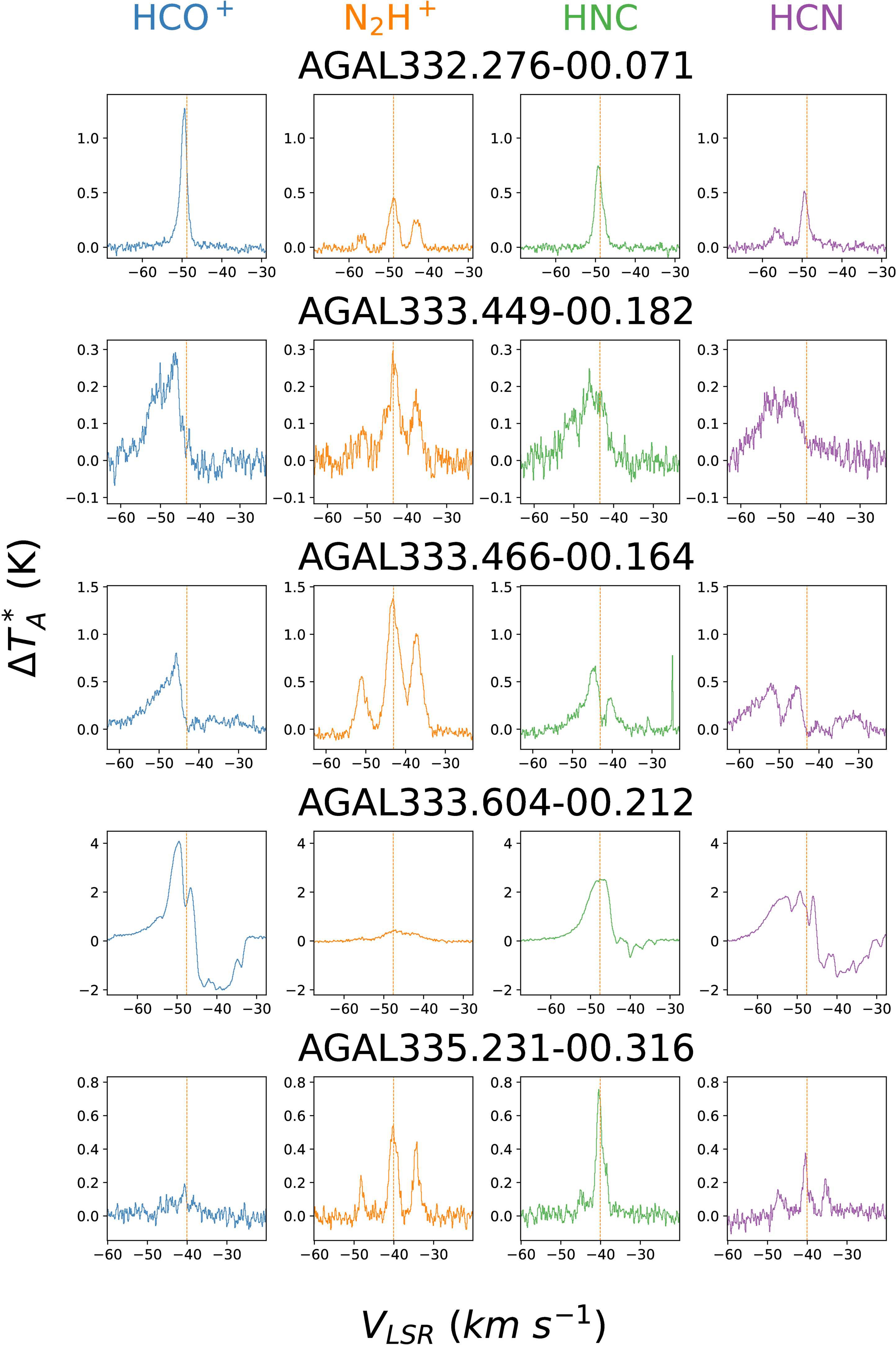 Mopra 3 mm spectra of the HCO+ (1–0), N2H+ (1–0), HCN (1–0), and HNC (1–0) lines. Same as Figure 4, but for different sources.