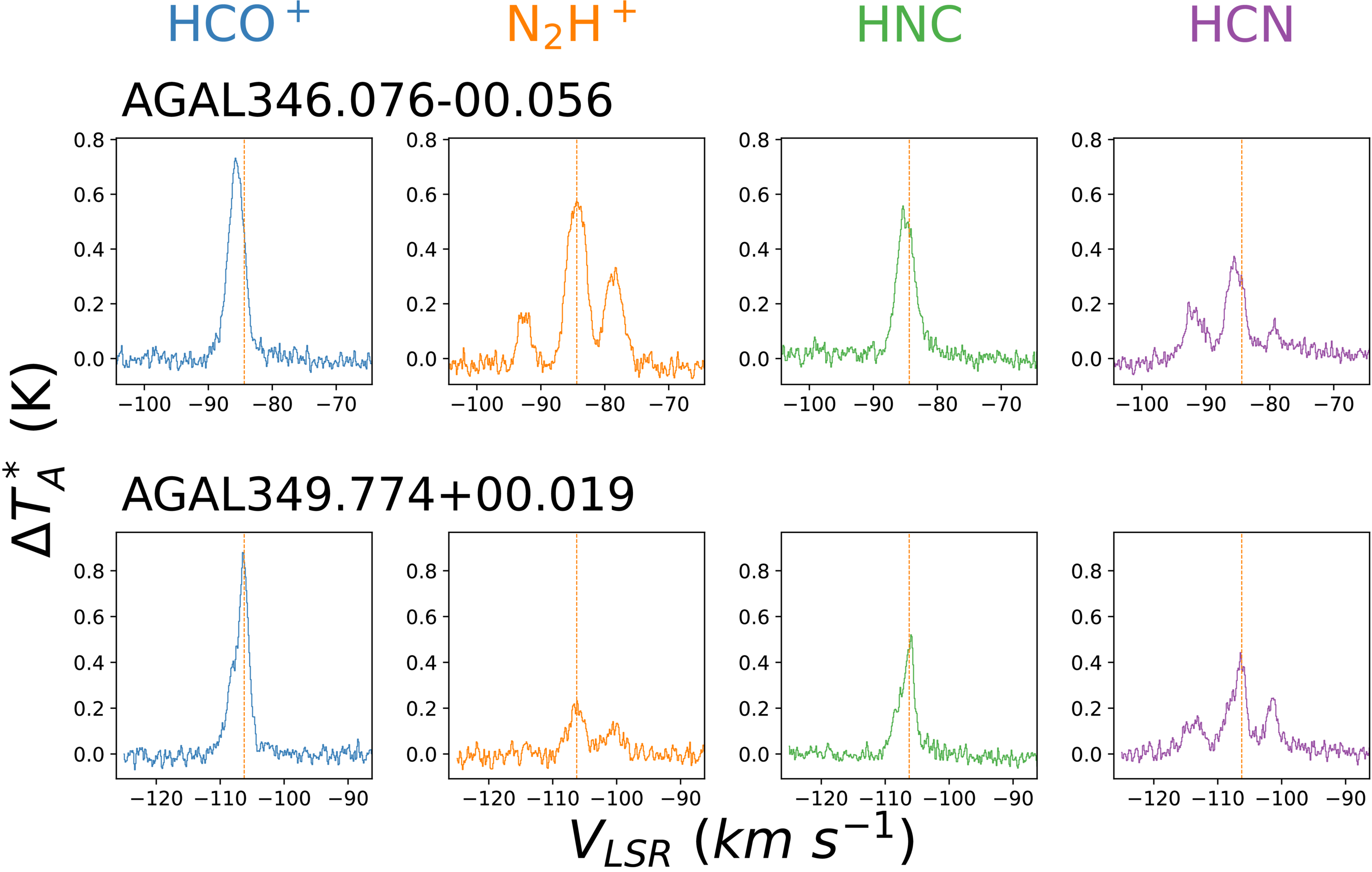 Mopra 3 mm spectra of the HCO+ (1–0), N2H+ (1–0), HCN (1–0), HNC (1–0), and H13CO+ (1–0) lines. Same as Figure 4, but for different sources.