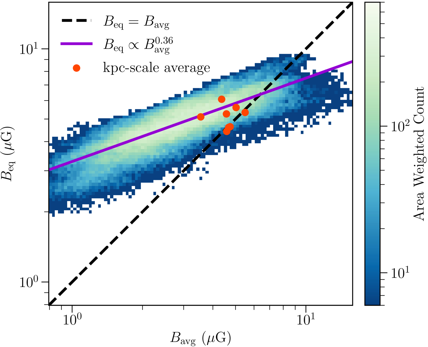 The blue distribution represents a two-dimensional histogram of the traditional equipartition magnetic field strength, Beq (Equation (15)), compared to the measured (mass-weighted) average magnetic field strength, Bavg. The distribution includes each pixel in projected maps across all R8 model snapshots. The best-fit power law to this distribution is included as a purple line with ﹩{B}_{{\rm{eq}}}\propto {B}_{{\rm{avg}}}^{0.36}﹩. The black, dashed line represents Beq = Bavg. The red points represent the values of Beq and Bavg averaged over each kiloparsec-scale simulation snapshot individually. While the large-scale snapshot-averaged value of Beq estimates the large-scale average of Bavg well, the pixel-by-pixel comparison shows that Beq fails to recover the true Bavg at smaller scales.