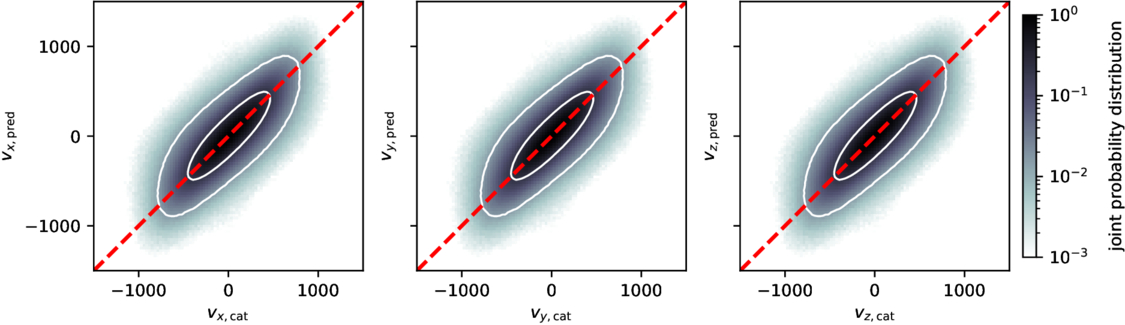 Joint probability distribution of the predicted peculiar velocity extracted at the positions of galaxies in all validation samples and the peculiar velocity values listed in the A-SIM galaxy catalog. The three panels correspond to the x-, y-, and z-components of the peculiar velocity from left to right, respectively. The white solid lines represent the 1σ and 2σ confidence level contours of the distribution. The red dashed diagonal line represents the one-to-one relation for reference. Pearson correlation coefficients between predicted peculiar velocities and those from the galaxy catalog are 0.52 ± 0.11 for the x-, 0.43 ± 0.12 for the y-, and 0.48 ± 0.12 for the z-components of the velocity field (mean and 1σ standard deviation across all validation samples).
