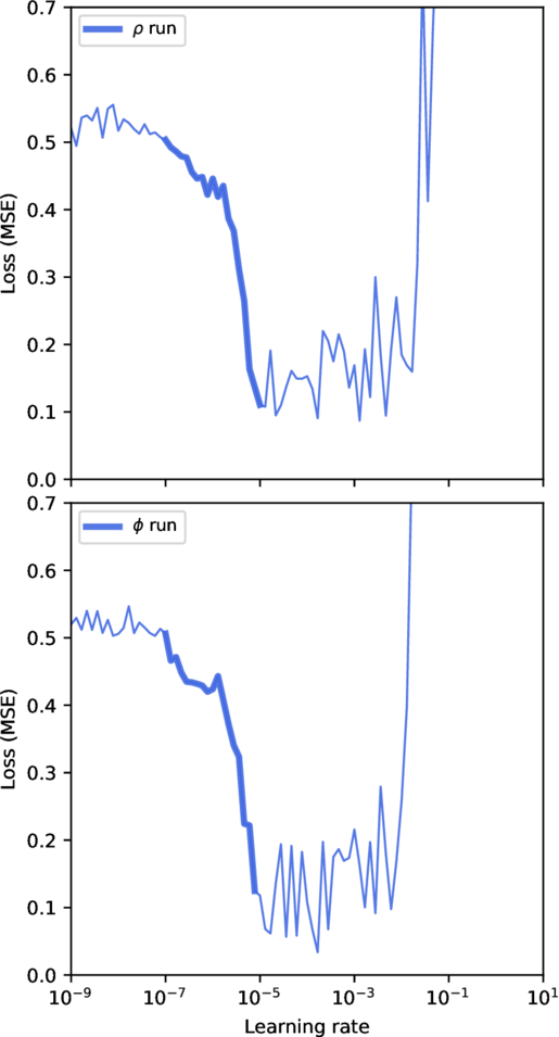 Learning rate range test showing the evolution of the loss ﹩{{ \mathcal L }}_{{\rm{MSE}}}﹩ as a function of the learning rate α. Top: test training on the dark matter density field. Bottom: test training on the gravitational potential field. The adequate range for the triangular cyclic learning rate used for the final training is shown as a thicker solid line on each panel.