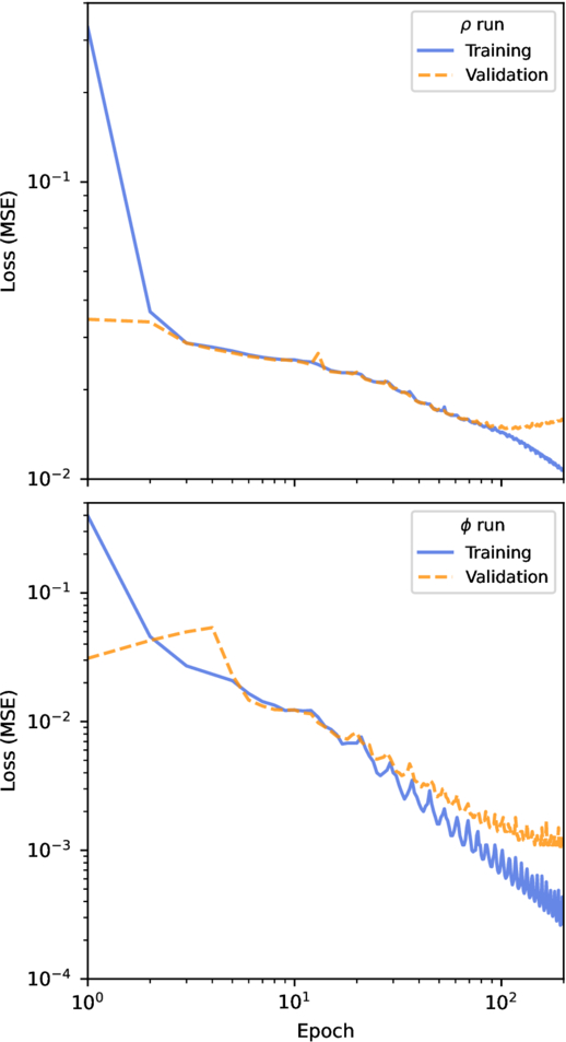 Evolution of the loss ﹩{{ \mathcal L }}_{{\rm{MSE}}}﹩ as a function of epoch for training on the dark matter density field ρ (top) and the gravitational potential field ϕ (bottom). The training loss is shown as a blue solid line, while the validation loss is represented by an orange dashed line.
