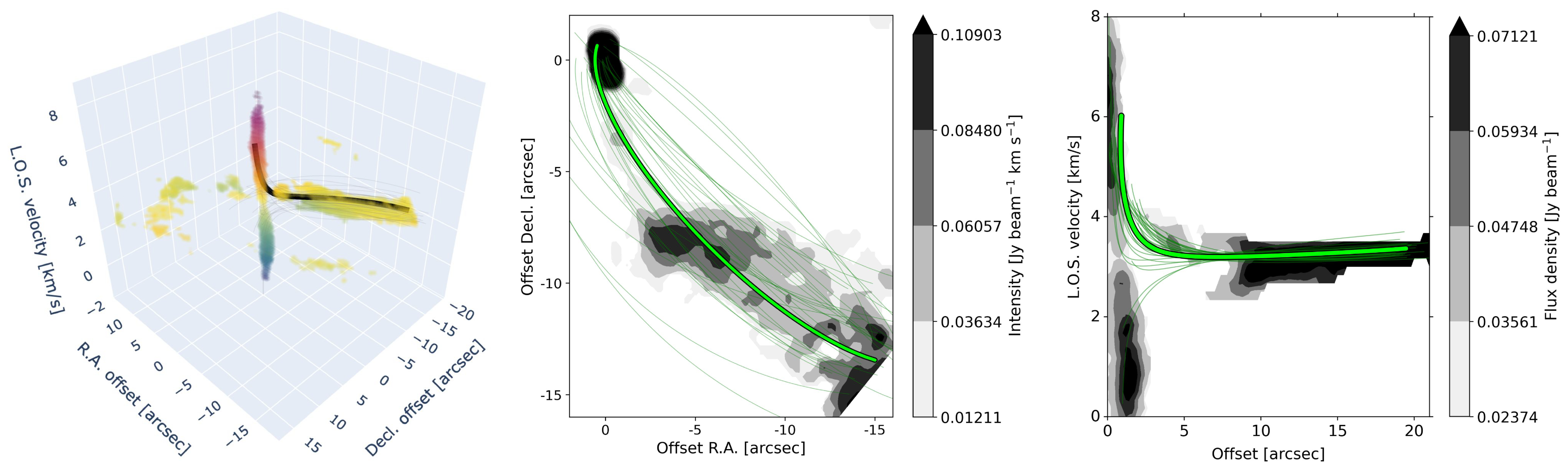 The best-fitted trajectory from TIPSY, as discussed in Section 4.1, compared to C18O (2–1) data. The left panel shows the full 3D PPV diagram of the molecular-line data, with the black line denoting the best fit. The center and right panels show integrated intensity (moment 0) and position–velocity diagrams for the streamer, respectively, with green curves representing the best fit. Thinner curves in all panels represent trajectories generated from 30 parameter combinations, randomly sampled from a Gaussian distribution based on the uncertainties of the fitted trajectory. An interactive version of the left panel is available online, allowing rotation and zooming of the 3D structures.