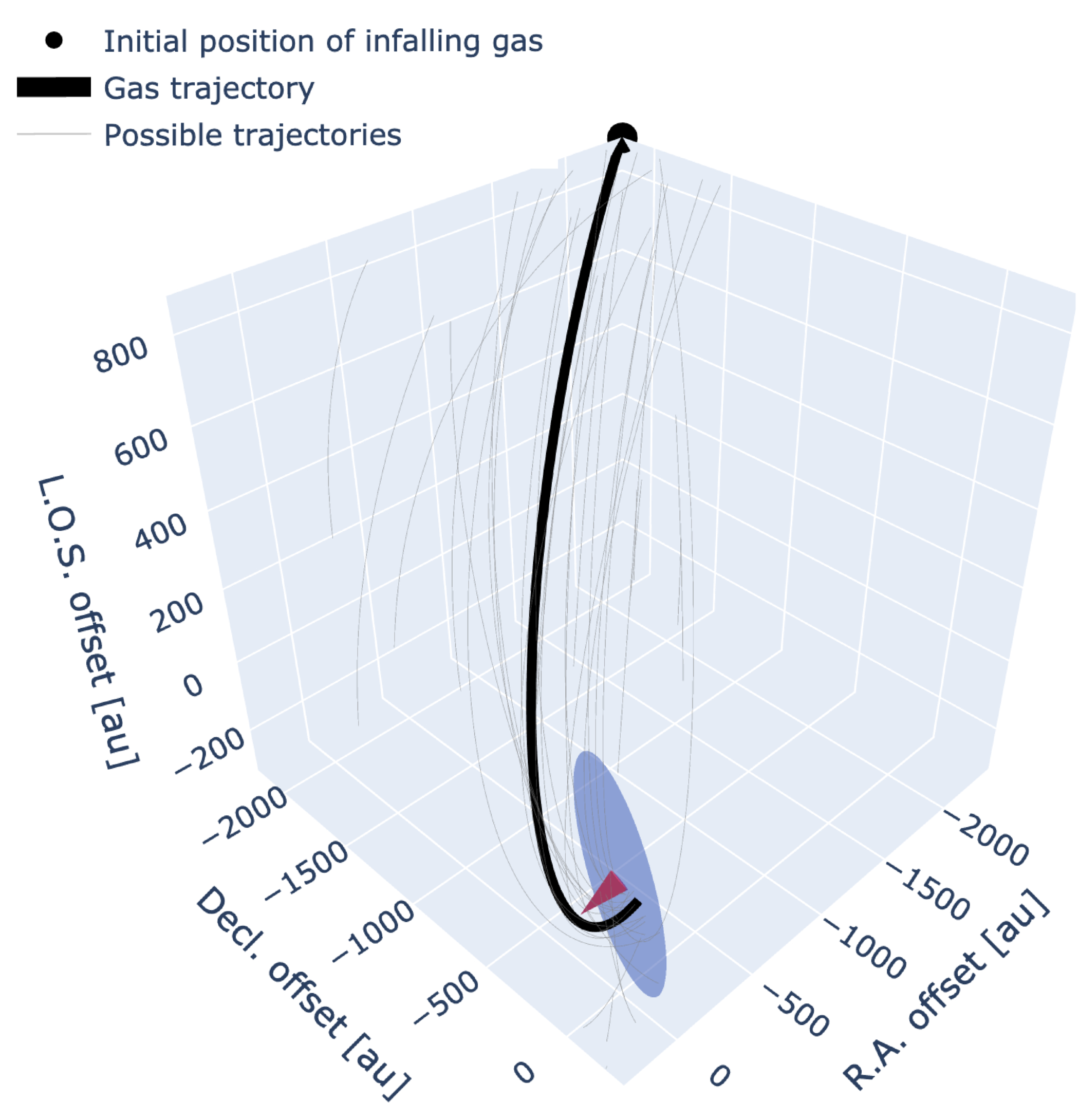 Isometric projection of the best-fit infalling trajectory (thick black line) and associated uncertainties (thin gray lines) for the streamer, as discussed in Section 3.1, in 3D position–position–position space (RA, decl., and LOS distance). The blue disk and red cone represent the protoplanetary disk and its angular momentum orientation, respectively, as discussed in Section 3.3. An interactive version of this figure is available online, allowing rotation and zooming of the 3D structures. In addition, the symbol key in the upper left can be clicked to turn these structures on or off in the interactive figure.