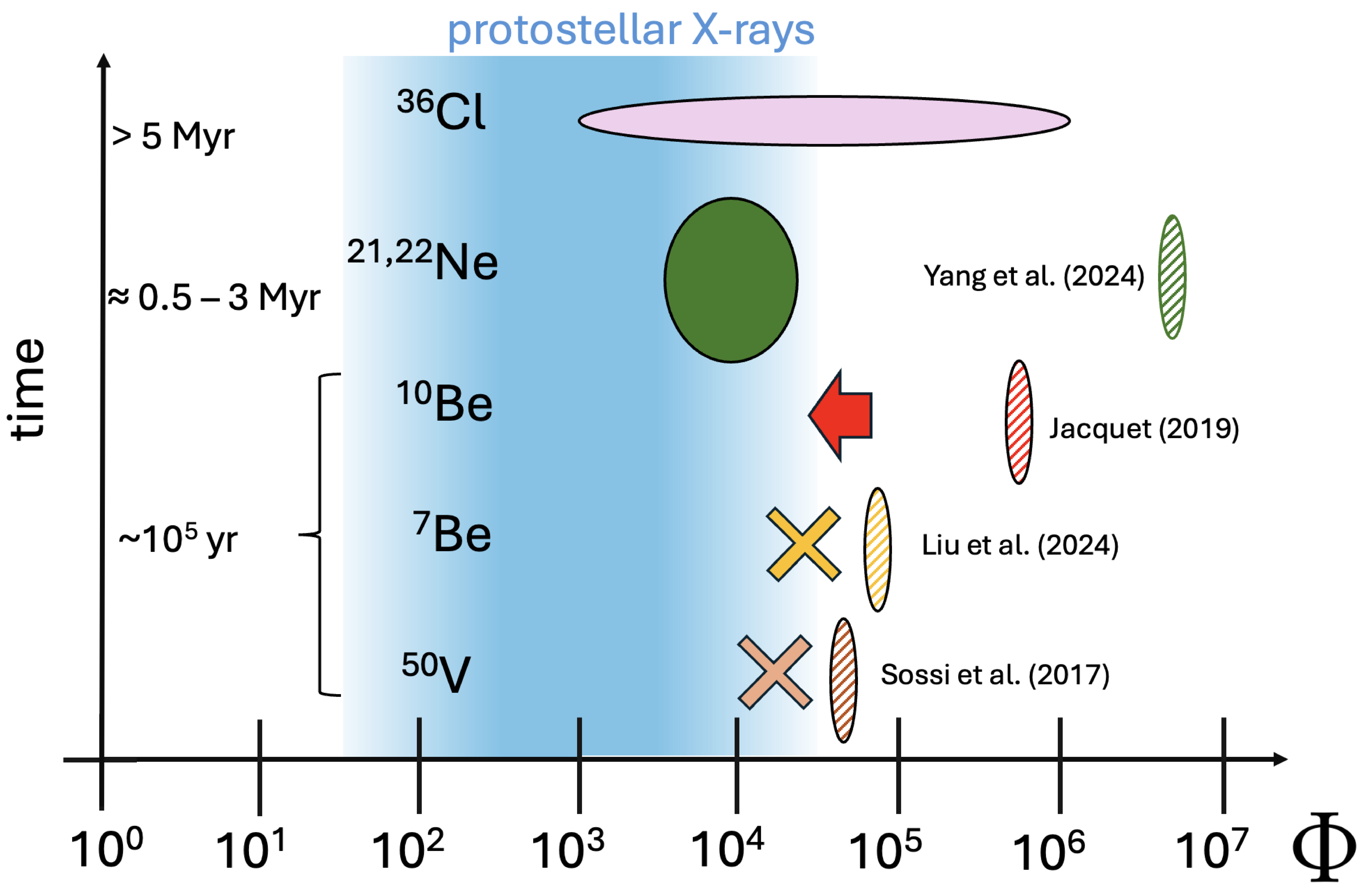 Constraints on Φ (the factor by which the SEP flux was enhanced above the present-day value, 100 cm−2 s−1 particles with E > 10 MeV nucleon–1 at 1 au), from various meteoritic data. P. A. Sossi et al. (2017) suggested Φ ≈ 6 × 104 from V isotope anomalies in CAIs, refuted by D. V. Bekaert et al. (2021), who showed these are attributable to evaporation. M.-C. Liu et al. (2024) argued for Φ ≈ 9 × 104 based on a presumed abundance of 7Be in one CAI. Our refutation of its existence (Section 6) renders this constraint moot. E. Jacquet (2019) argued for Φ ≈ 9 × 105 based on perceived heterogeneities in 10Be/9Be ratios among CAIs. Our demonstration that 10Be/9Be ratios were homogeneous at 7 × 10−4 (Section 5) puts a limit Φ ≪ 105 for how much 10Be was created by irradiation. X. Yang et al. (2024) argued for an exceptionally high value Φ = 6 × 106 based on their interpretation of how cosmogenic Ne was produced in hibonite grains. Our modeling (Section 4) demonstrates that the Ne likely was produced in a disk subject to Φ ≈ 3 × 103 to 2 × 104. Finally, our modeling of 36Cl production after disk dissipation (Section 3) demands Φ < 106, possibly ≈103, depending on the chemical composition of ice. No meteoritic data demand values greater than Φ ≈ 3 × 103, which makes the proto-Sun consistent with the range Φ ≈ 3 × 102 to 3 × 103 inferred from X-ray observations of protostars (S. J. Wolk et al. 2005) in the shaded bars (which include some uncertainty about the proton flux per X-ray flux). The early Sun appears to have been a typical protostar, and data or models suggesting otherwise should be scrutinized.
