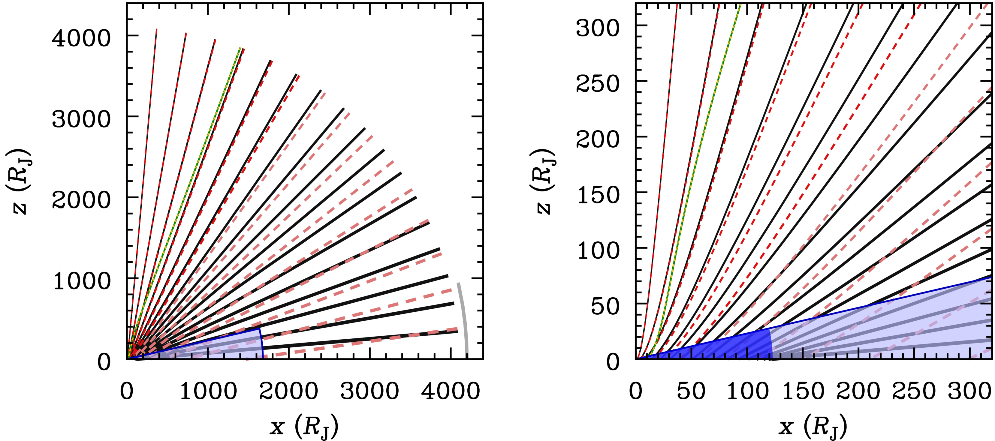 Flow pattern in the poloidal plane (“side view”) for the fiducial parameters in MKBM23. We set fcent = 0.03 (see Figure 13 for fcent = 1/3). For illustrative purposes, the CPD (blue region) ends at r = ξRHill with ξ = 0.4 (R. G. Martin et al. 2023), with the region inside Rcent = fcentRHill highlighted (dark blue). We plot implicitly the exact solution of the orbit equation (solid lines) and the small-θ0 solution (dashed red lines; pale for θ0 > 30°). The green–yellow line is the θ0 = 20° streamline from MKBM23, which is close to the θ0 = 15° streamline at our r0 = RHill. Streamlines starting closer to the midplane are shown thicker to remind the reader of the density stratification (Equation (10)). The gray arc near RHill displays the height of the CPD (90° − θCPD), and we will assume that there is in fact no inflow over those θ0 (Sections 2.2 and 2.3).