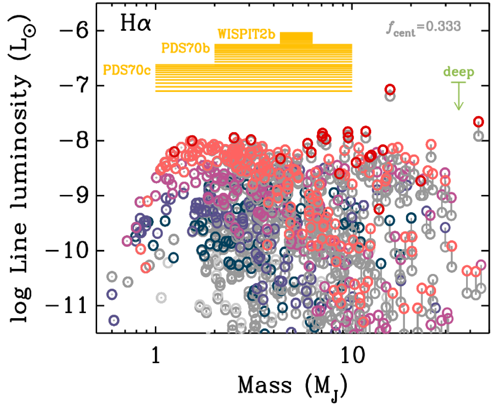 The same as in Figure 6 but for fcent = 1/3 and only using our model. Each synthetic planet has two points, connected by a line, showing only the planet surface contribution Lplant surf (lower, always gray) and the total Lplant surf + LCPD (higher point of the pair).