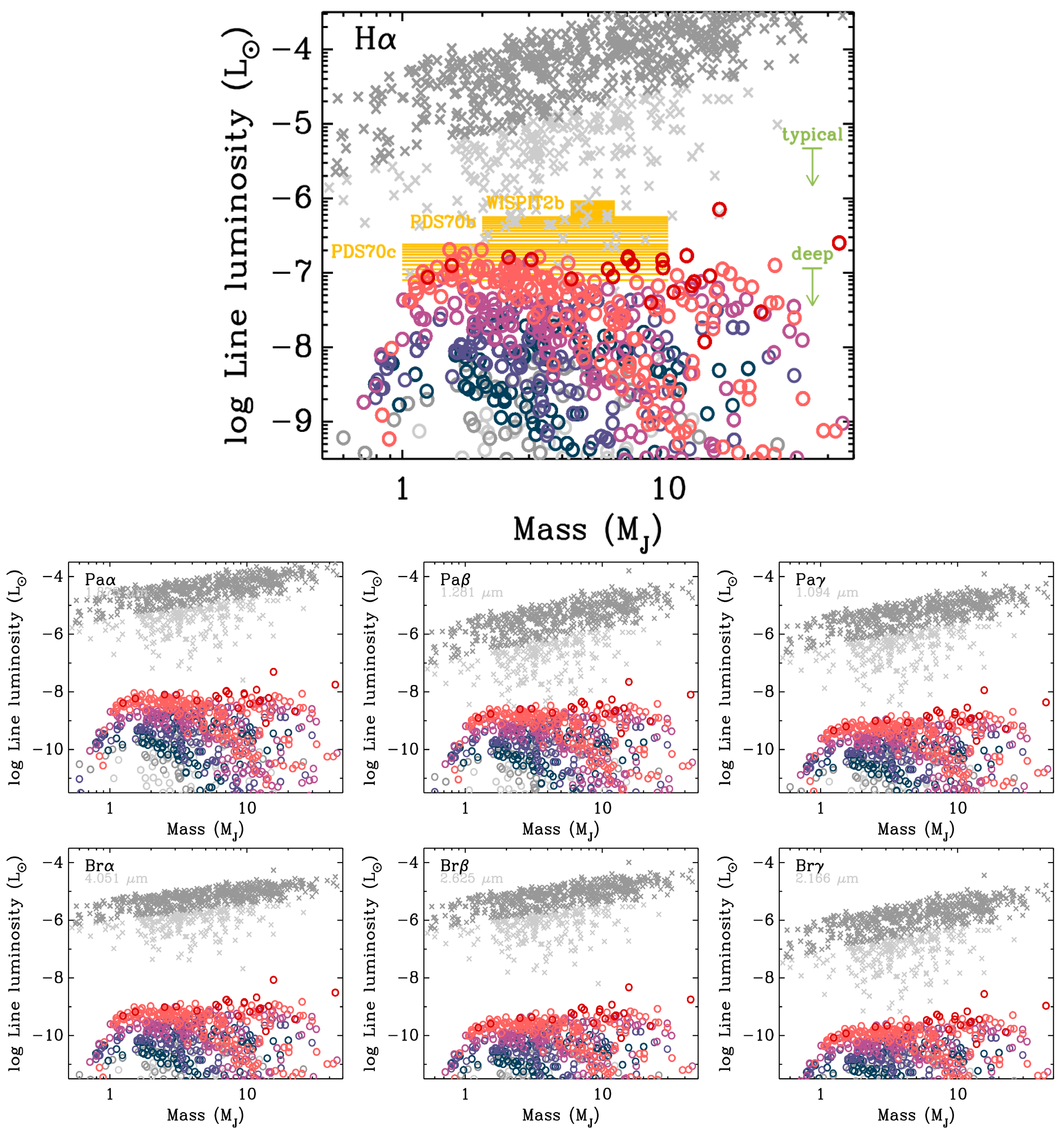 Excess line luminosity of accreting planets (open dots; see label in panels), summing the planet- and CPD-surface shocks. We plot population synthesis planets during their main formation phase (1–5 Myr together). Points are colored by accretion rate as in Figure 4(b). The gray crosses (dark for ﹩{\dot{M}}_{\,\rm{pop synth}\,}\geqslant 1{0}^{-6}\,{M}_{{\rm{J}}}\,{{\rm{yr}}}^{-1}﹩, pale otherwise) are the estimate using extrapolated CTTS relationships (J. M. Alcalá et al. 2017; O. Komarova & W. J. Fischer 2020; C. Rogers et al. 2024), using the classical ﹩{L}_{{\rm{acc}}}=G{\dot{M}}_{{\rm{Hill}},\,{\rm{net}}}{M}_{{\rm{p}}}/{R}_{{\rm{p}}}﹩. Top panel: the nondereddened luminosity and estimated masses of PDS 70 b and c (see the text) are plotted for guidance (horizontal bars; height: variability of LHα). Also, WISPIT 2 b is shown (L. M. Close et al. 2025b). Some synthetic planets are as faint as LHα ∼ 10−12 L⊙ (not shown). Segments on the right show typical or deep 99.99995% confidence-level upper limits, beyond 200 mas, from surveys or individual searches (respectively, G. Cugno et al. 2019, 2023; K. B. Follette et al. 2023), corresponding to 5σ for Gaussian residuals. Limits for individual stars can easily differ by 1 dex.
