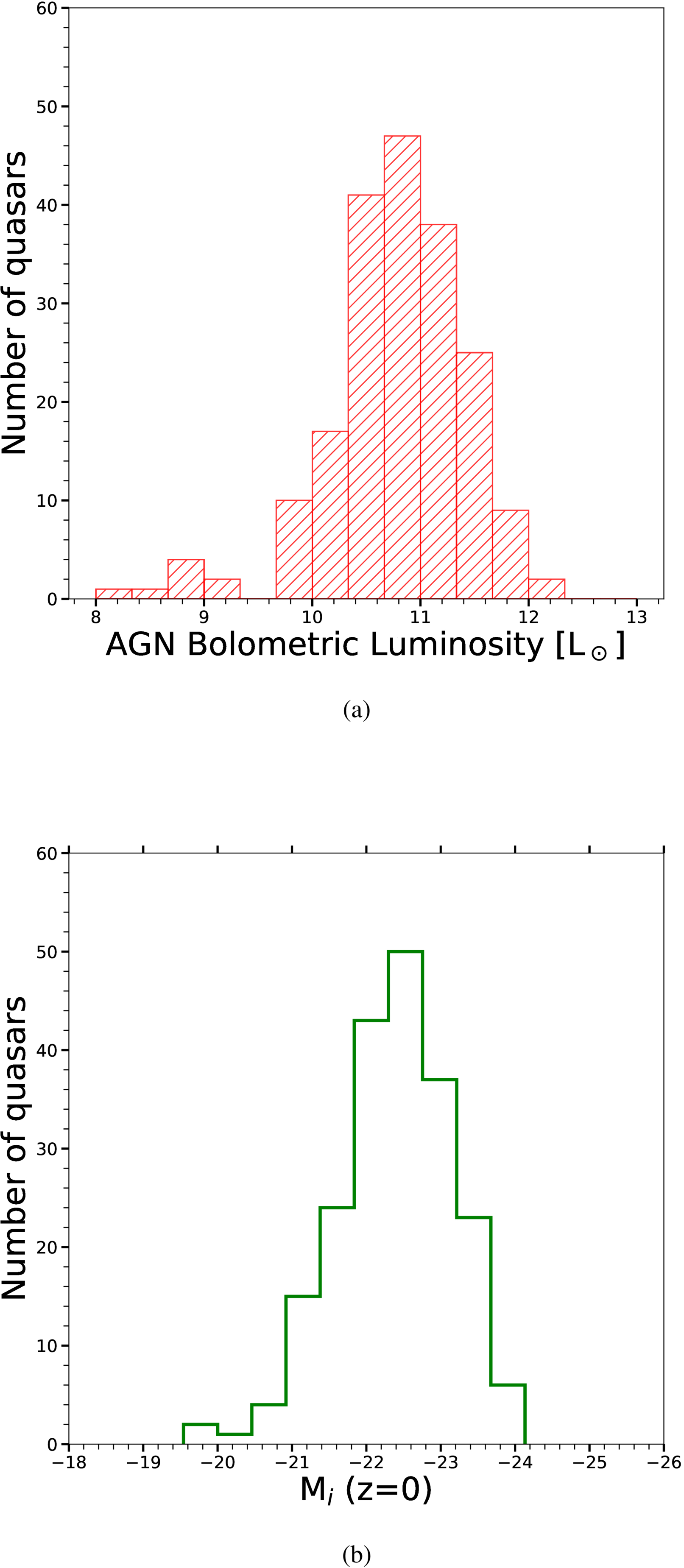 (a) Distribution of bolometric luminosities for quasars derived from CIGALE fits. This excludes eight quasars (3.9% of the quasar sample) where CIGALE did not return a quasar luminosity. (b) Distribution of absolute SDSS i-band magnitude (k-corrected and extinction corrected based on GAMA survey data).