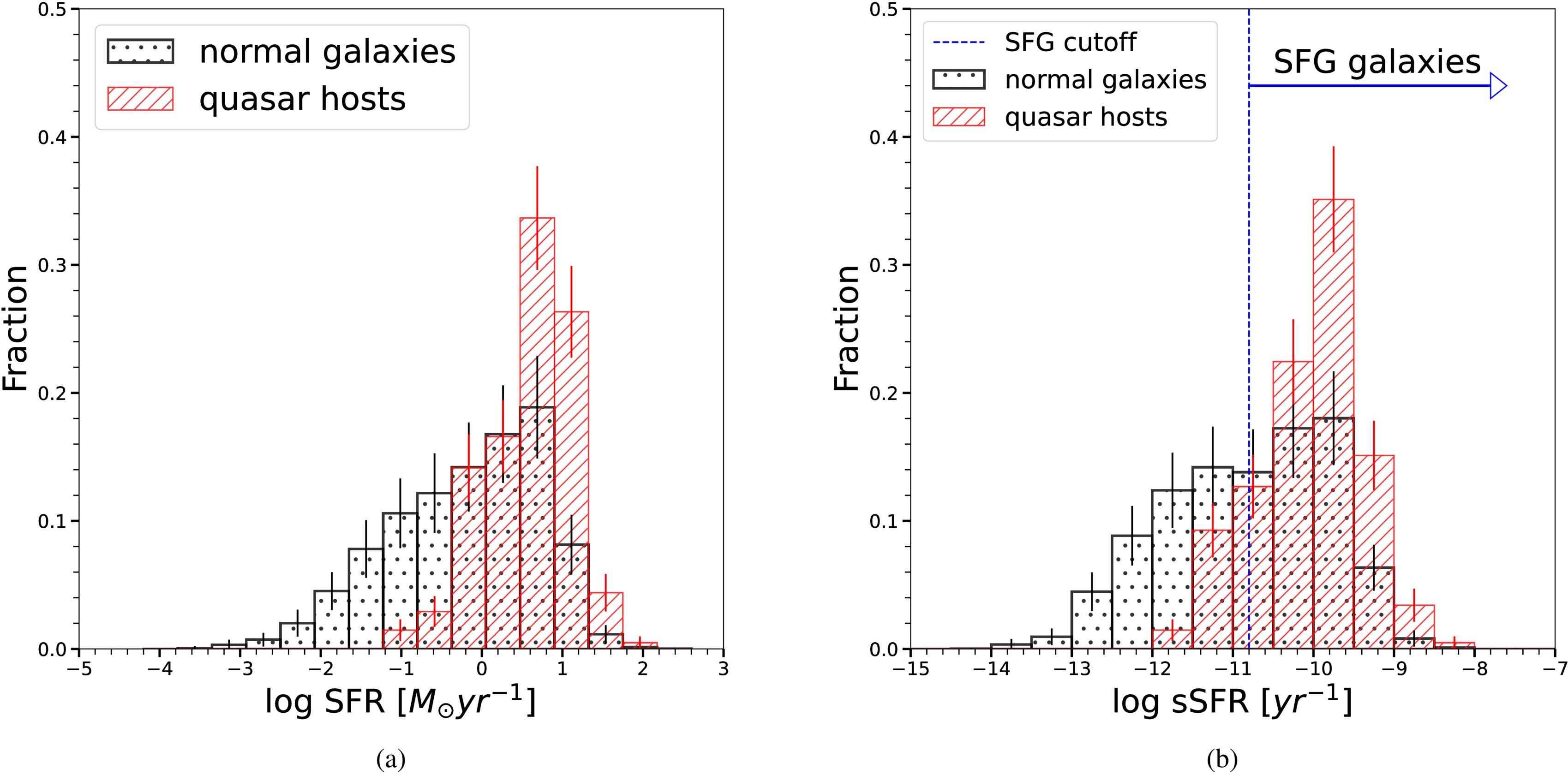 Histograms of star formation properties with Poisson error bars: (a) SFR, (b) sSFR. Data for comparison galaxies are from the GAMA archive, for quasar hosts from CIGALE SED fits. For quasar hosts, CIGALE SFR and sSFR estimates are corrected to the MAGPHYS baseline, and the error bar represents the Poisson error. For comparison galaxies, the plotted fraction in each bin is the average fraction from all 200 realizations, and the error bar represents the standard deviation. In each case, the distribution of values for the quasar sample lies at the peak of the normal galaxy distribution. However, there are few quenched AGN hosts.