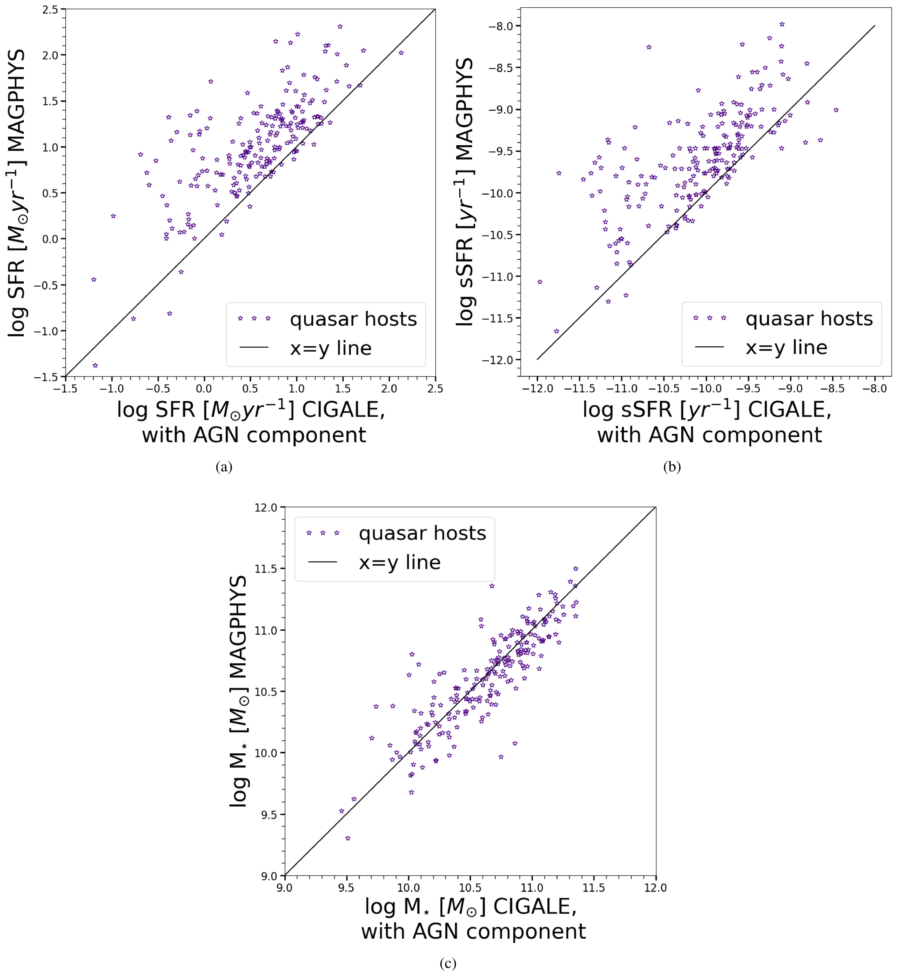 Results for comparison test A. Comparison between the GAMA archival data (MAGPHYS SED fitting results with no AGN component) and our CIGALE SED fitting results (including an AGN component) for (a) SFR, (b) sSFR, and (c) stellar mass for the sample of quasar host galaxies. The SFR and sSFR estimates differ significantly when an AGN contribution is included in the SED analysis, prompting us to derive anew the star formation property estimates for the quasar sample.