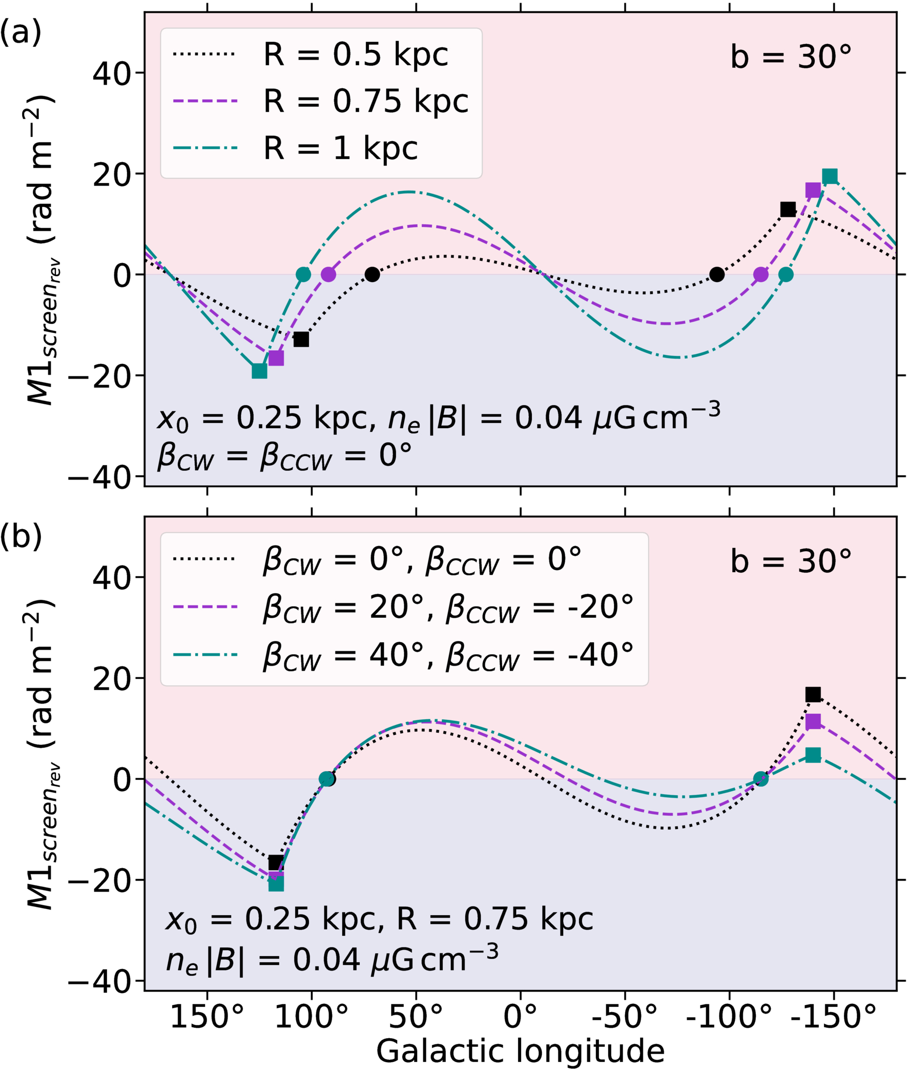 A demonstration of how changing the parameters of the planar reversal model adjusts the simulated ﹩{{\rm{M1}}}_{{{\rm{screen}}}_{{\rm{rev}}}}﹩ profiles for Galactic latitude b = 30°. Red and blue shading are included for quick visual identification of the positive and negative peaks. (a) Varying the path length, R, shifts the longitude of the zeros (circles) and peaks (squares) horizontally. (b) Varying the vertical tilt angles, βCW and βCCW, shifts the profiles vertically.