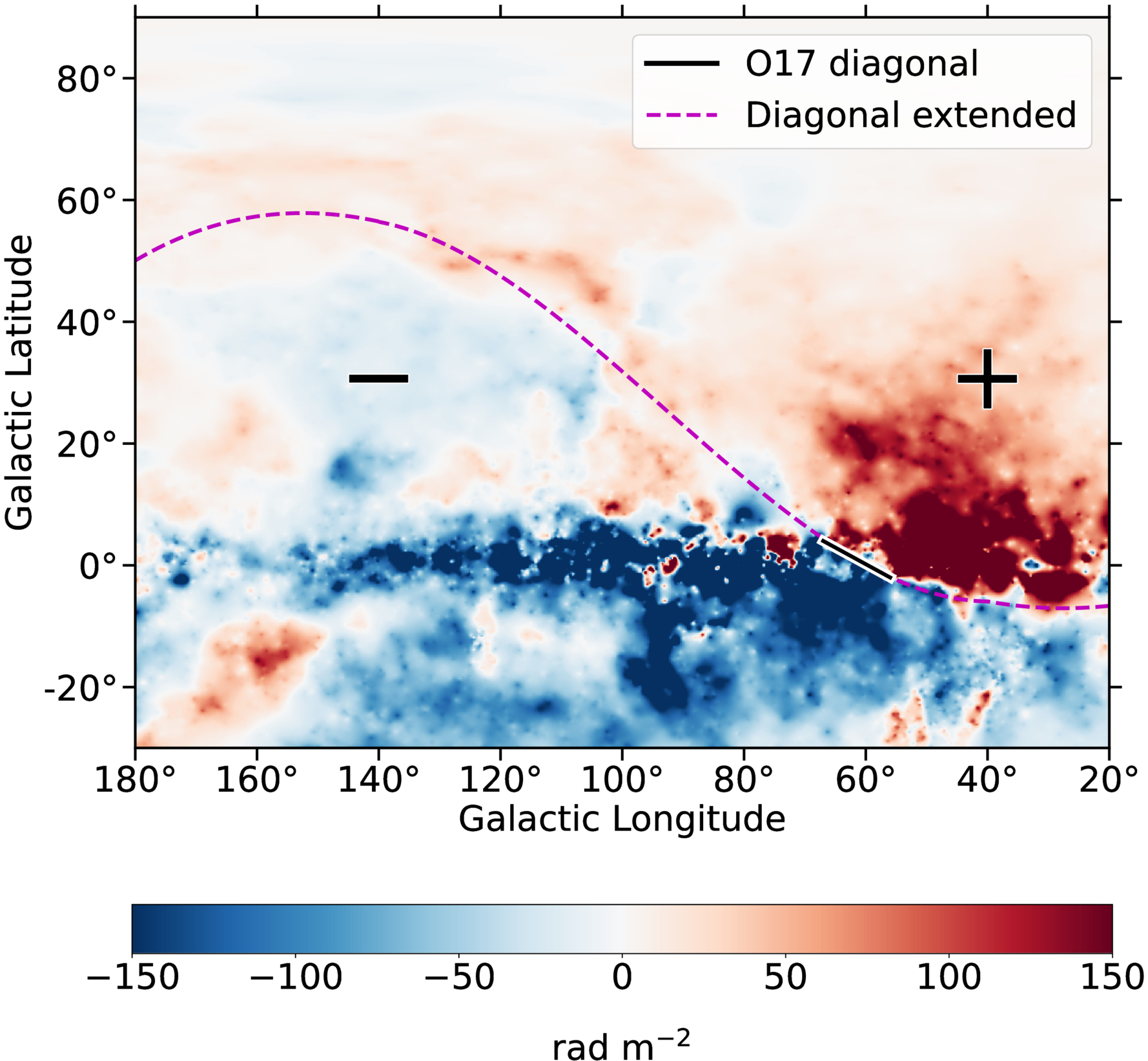 The O17 diagonal (black) plotted on the H22 map. The dashed magenta line demonstrates how a curved extension of the diagonal separates adjacent peaks of the ﹩\sin 2\ell ﹩ pattern, marked with − and + signs.