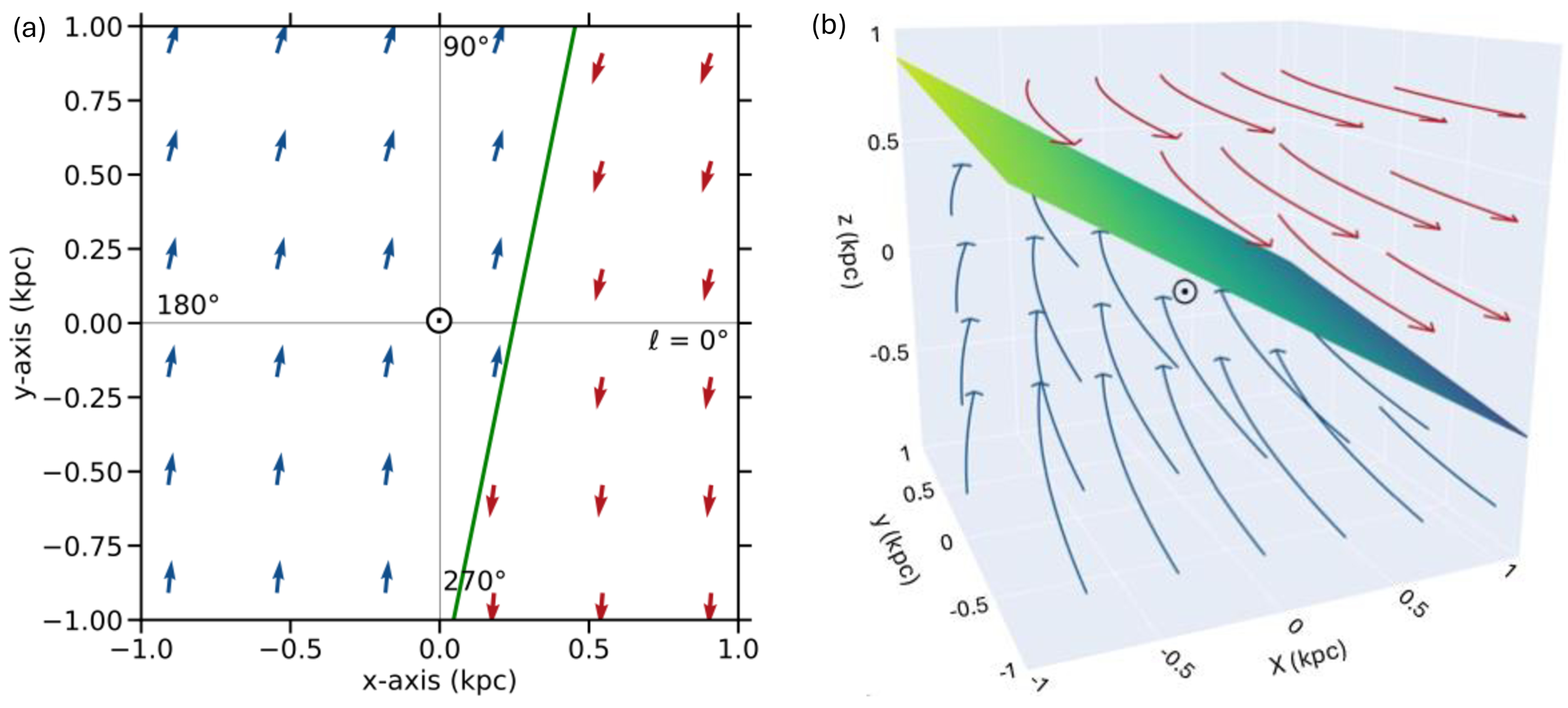 The planar reversal model. (a) A cross section along the x–y plane with the positive x-axis toward the Galactic center, located at (8.15, 0, 0) kpc. The green line indicates the orientation of the reversal, with a clockwise field (blue arrows) on the near side, and counterclockwise field (red arrows) on the far side. (b) The reversal model in three-dimensional space. The reversal is depicted as a diagonal plane separating a region with a clockwise field (blue arrows) below and a counterclockwise field (red arrows) above. The blue to yellow plane colors reflect the z-values to enhance three-dimensional visualization. The position of the Sun is shown by ⊙.