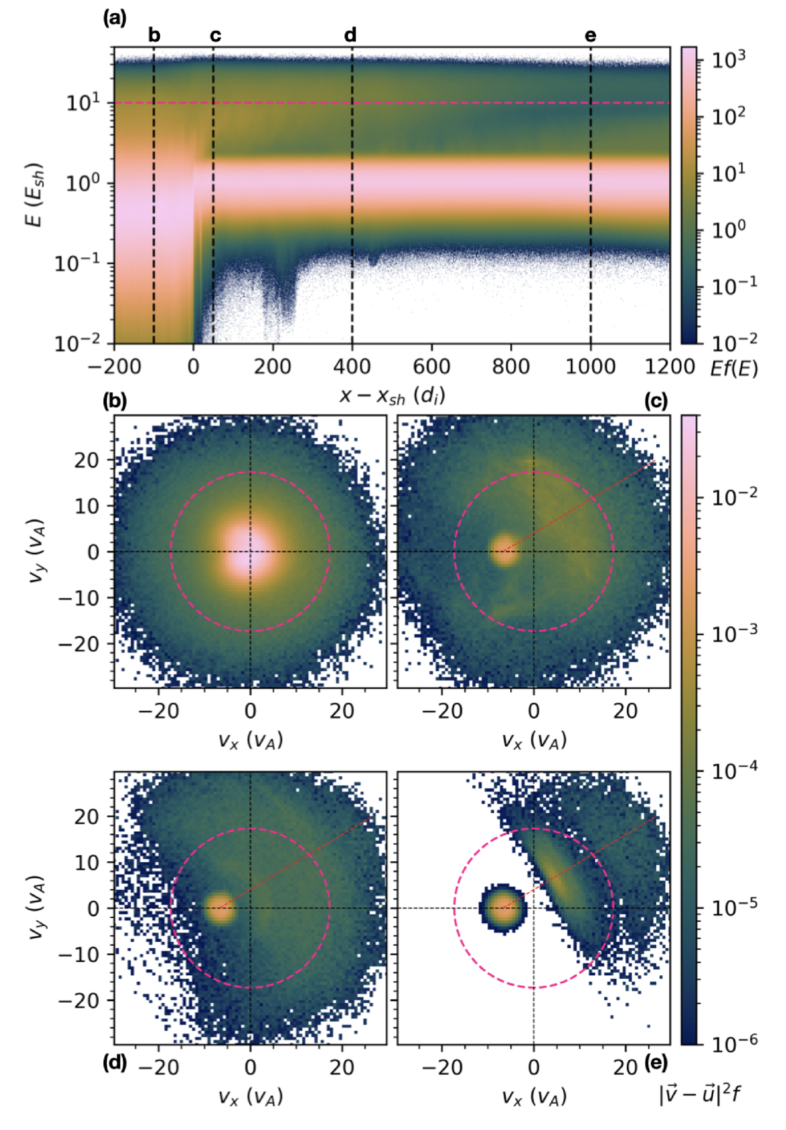 (a) The reduced ion energy distribution for a 2di slice in the y-direction as a function of shock-normal direction and energy. (b)–(d) Ion distribution functions at the locations shown by the dashed lines in (a), scaled by ∣v − u∣2. The distribution functions are plotted in the vx, vy plane and integrated over the vz-direction. All the distribution functions are averaged in time over ﹩50{{\rm{\Omega }}}_{\mathrm{ci}}^{-1}﹩ at ﹩0.5{{\rm{\Omega }}}_{\mathrm{ci}}^{-1}﹩ intervals and are determined in the shock frame.