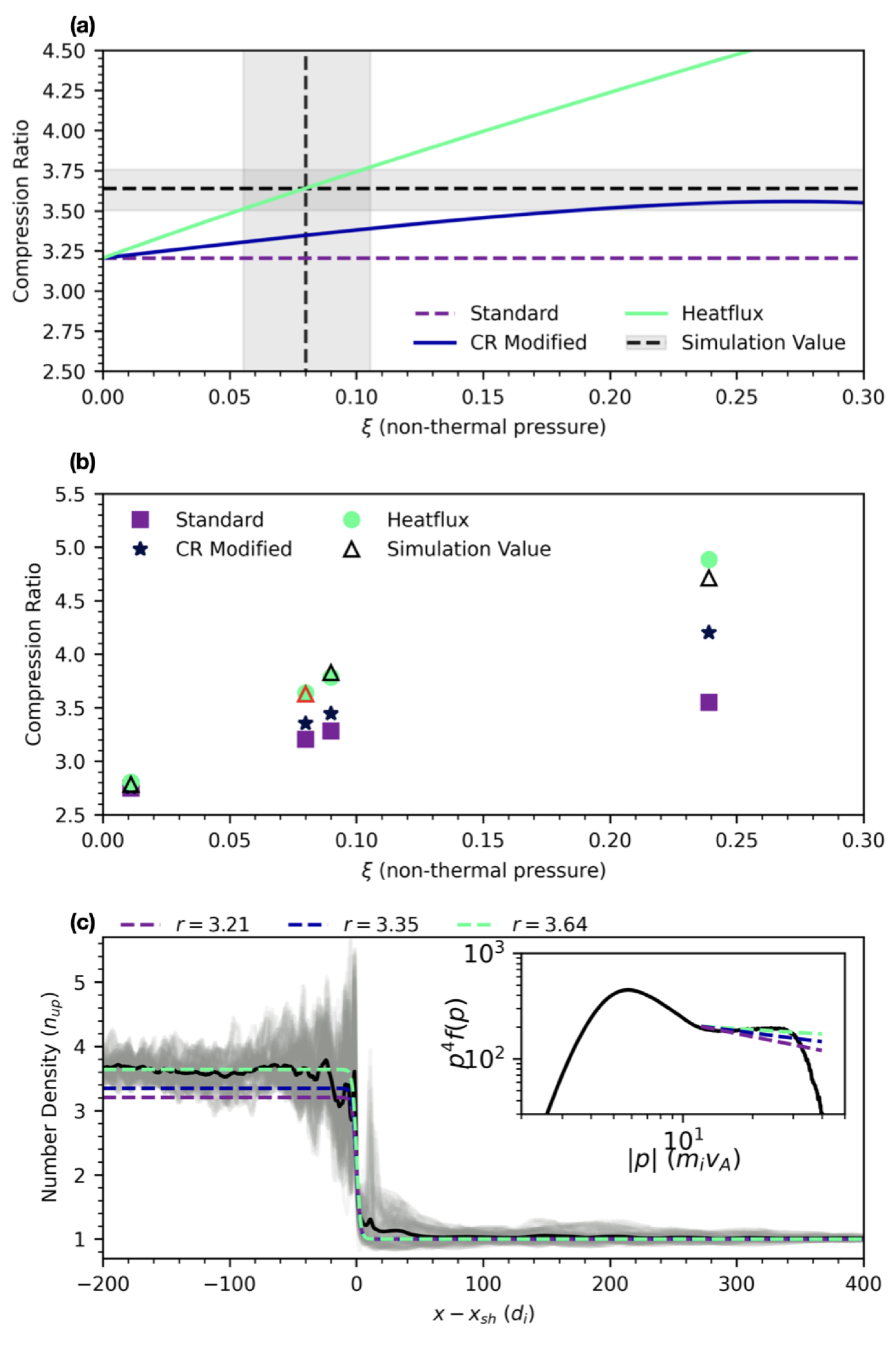 (a) Predictions for the shock compression ratio as a function of the normalized nonthermal pressure (ξ) from different theories as given in the legend. The black dashed lines show the simulation-measured nonthermal pressure (vertical) and compression ratio (horizontal), and the theory presented in this work in teal. (b) Scatter plot for the different compression ratio predictions for four different shock simulations as a function of measured nonthermal pressure (ξ) and Mach number. The red triangle denotes the simulation presented in the other figures. (c) The ion number density plotted as a function of shock-normal distance (time-averaged as in Figures 1 and 3). The inset shows the average downstream distribution function (multiplied by p4) as a function of momentum. The predicted nonthermal power-law indices are shown by the dashed lines based on standard DSA theory from the corresponding compression ratios.