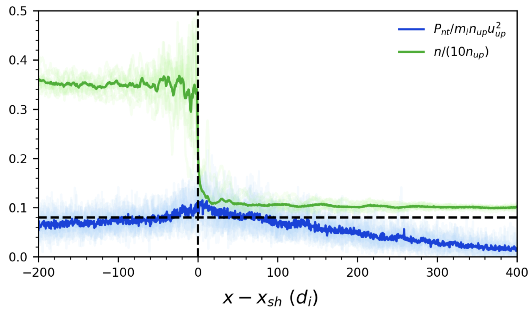 The nonthermal pressure and the total ion number density (divided by 10). One-dimensional cuts are normal to the shock and centered around the shock front, and are time-averaged as discussed in Figure 4.