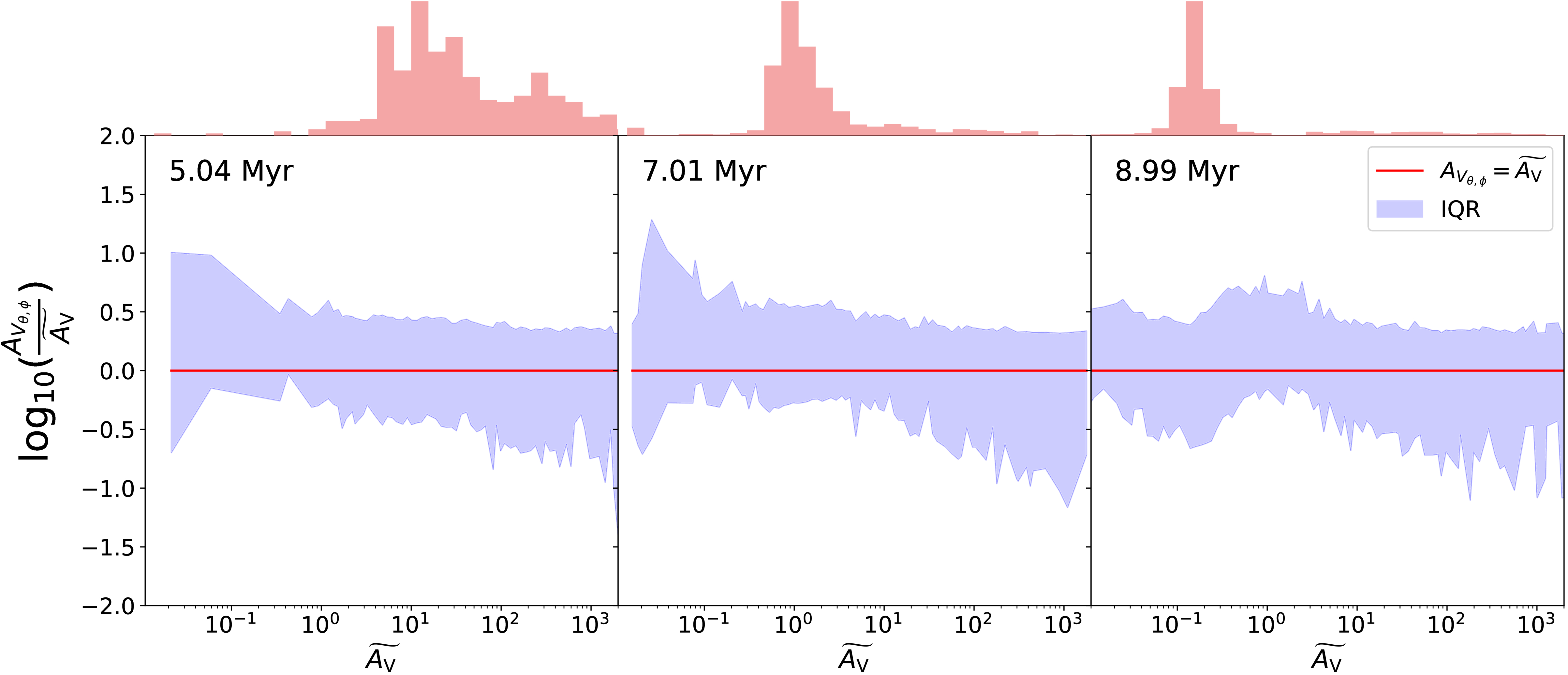Interquartile ranges (IQRs) for the log ratio of stellar AVs at different viewing angles, ﹩{{A}_{{\rm{V}}}}_{\theta ,\phi }﹩, and a function of the median extinction ﹩\widetilde{{A}_{{\rm{V}}}}﹩, shown for three different times in the simulation. Shown in red is the one-to-one line where ﹩{{A}_{{\rm{V}}}}_{\theta ,\phi }﹩ is equal to ﹩\widetilde{{A}_{{\rm{V}}}}﹩, while the blue shaded region shows inner quartile range. The histograms above are the number density of stars at a given ﹩\widetilde{{A}_{{\rm{V}}}}﹩ at that time, showing how many stars are contributing to the IQR.
