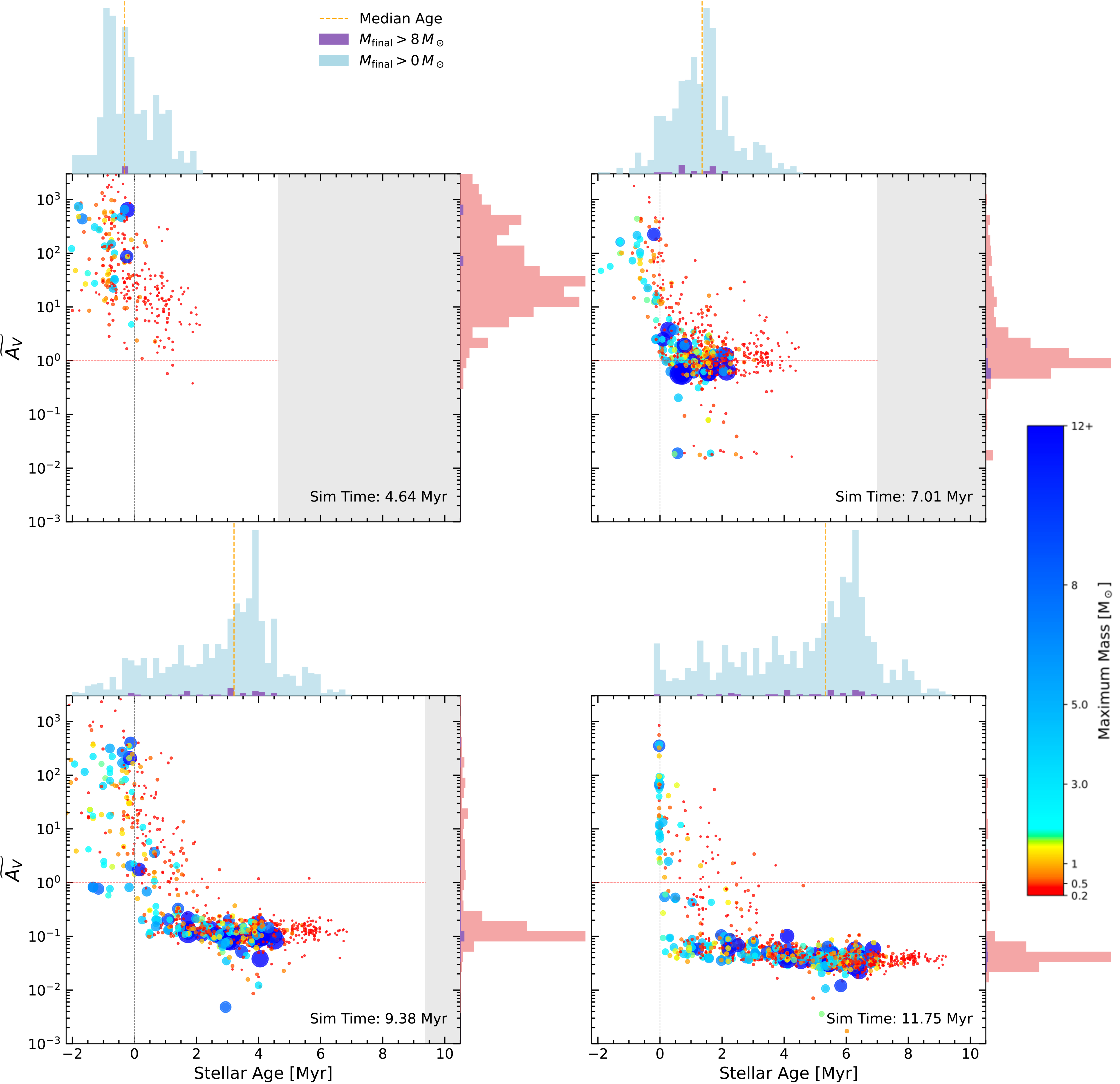 Each star’s extinction as a function of stellar age, for four simulation snapshots. A movie showing each snapshot is available. The extinction is taken to be the median value across all viewing angles, and age zero corresponds to the time the star reaches its maximum mass (Figure 1), which is shown by the dashed vertical line. The horizontal red line at ﹩\widetilde{{A}_{{\rm{V}}}}=1﹩ corresponds to the red points in Figure 4. In each snapshot, the extinction decreased exponentially, with a precipitous decay around the time the star reaching it’s maximum mass. Additionally, the time a star remains heavily embedded appears to depend on stellar mass, where most red points stay above the ﹩\widetilde{{A}_{{\rm{V}}}}=1﹩ line well after their zero age, compared to stars >8 M⊙ that tend to fall below this threshold right around this zero age. We discuss this trend further in Figure 8. The top histograms are number counts for stars of different ages, with blue depicting all stars, and purple representing stars larger than 8 M⊙. The side histograms are the number counts of stars at a given extinction. We see star formation occurring across the entire duration of the simulation, and high-mass stars form throughout. The movie can also be found on Zenodo: DOI: 10.5281/zenodo.17667459.