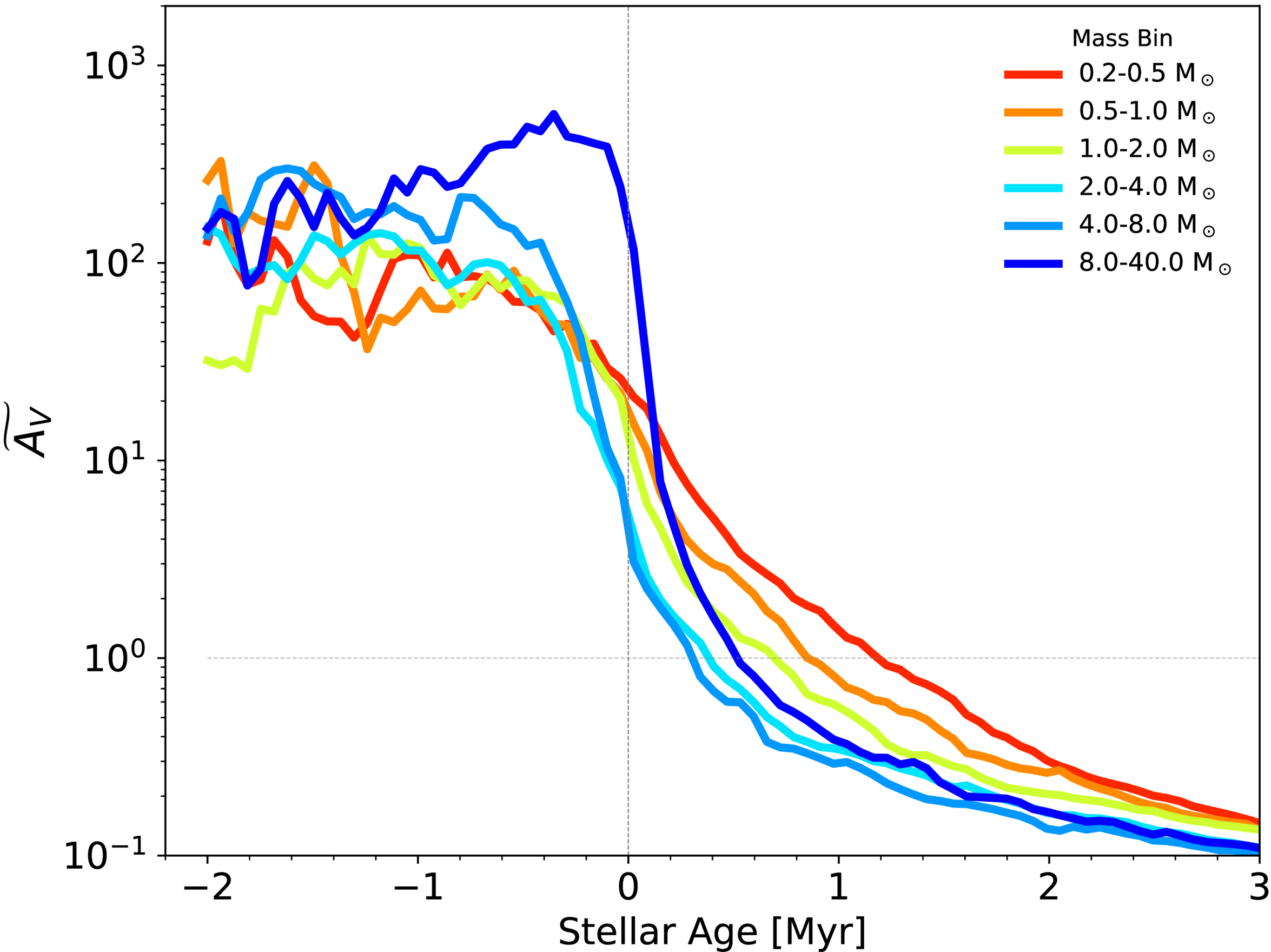 Stellar extinction tracks as a function of stellar age, binned by final mass. Lines represent the median values of stars in the mass bin, with colors corresponding to the final stellar mass in Figure 1. There is a clear trend with when a stars begins to decrease in ﹩\widetilde{{A}_{{\rm{V}}}}﹩ and the final mass of the star, as well as how long it takes that star to become un-embedded.