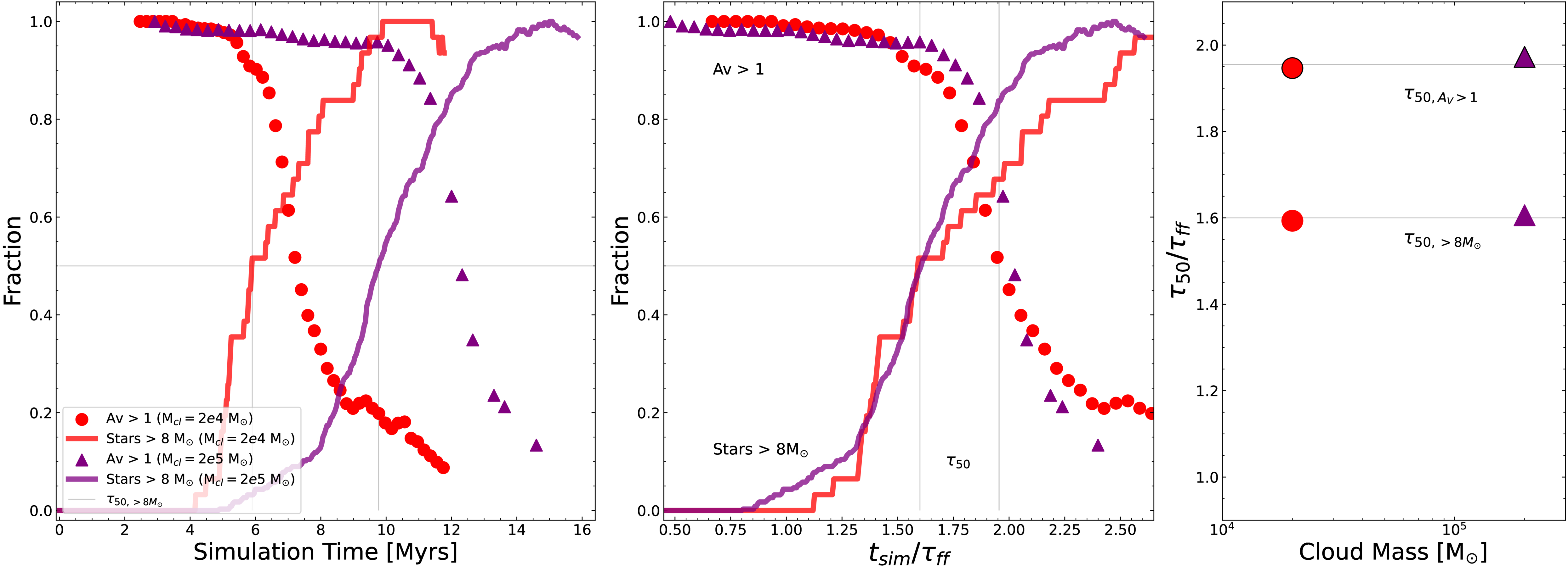 Comparison between two STARFORGE simulations, differing in molecular cloud mass. The fiducial 2 × 104 M⊙ cloud is shown in red, while the 2 × 104 M⊙ cloud is shown in purple. The left panel correspond to Figure 4, with points showing the fraction of stars with ﹩\widetilde{{A}_{{\rm{V}}}}﹩ > 1, while the solid lines show the fraction of stars >8 M⊙, which have begun their protostellar stage. The middle panel shows the same as the left panel, but is normalized by the respective cloud freefall times, τff, demonstrating that the start of emergence is related to initial cloud mass and density. The vertical gray lines correspond to ﹩{\tau }_{50,\gt 8{M}_{\odot }}﹩ and ﹩{\tau }_{50,{A}_{{\rm{V}}}\gt 1}﹩, which denote the time where 50% of the stars >8 M⊙ have begun their protostellar stages, and the time when 50% of the stars have an ﹩\widetilde{{A}_{{\rm{V}}}}﹩ > 1. These metrics are also shown in the right panel. In both simulations, the extinction is tied to the point in the star-forming event where the high-mass stars form.