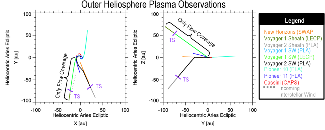 Few missions have collected solar wind measurements in the outer heliosphere. All of the missions except Pioneer 10 moved into the incoming interstellar wind direction. NH is moving along the same longitude as Voyager 2 but remaining in the ecliptic headed toward the ENA ribbon. This plot shows the trajectories of outer heliospheric missions in Heliocentric Aries Ecliptic coordinates when those missions measured the solar wind plasma. The X–Y (left) and Z–Y (right) planes are shown. The direction of the interstellar wind is shown in pink. In green the TS crossing of Voyager 2 is identified, and the color of the Voyager 2 trajectory is changed from black to gray at the TS. We note that only the flow estimates from LECP are available beyond 10 au for Voyager 1.